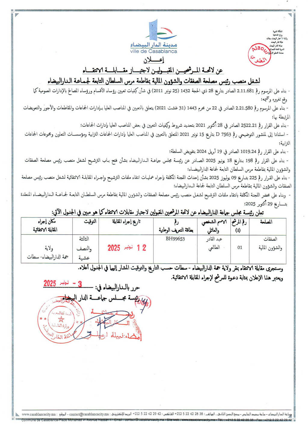 إعلان عن لائحة المترشحين المقبولين لاجتياز مقابلة الانتقاء لشغل منصب رئيس مصلحة الصفقات والشؤون المالية بمقاطعة مرس السلطان التابعة لجماعة الدار البيضاء