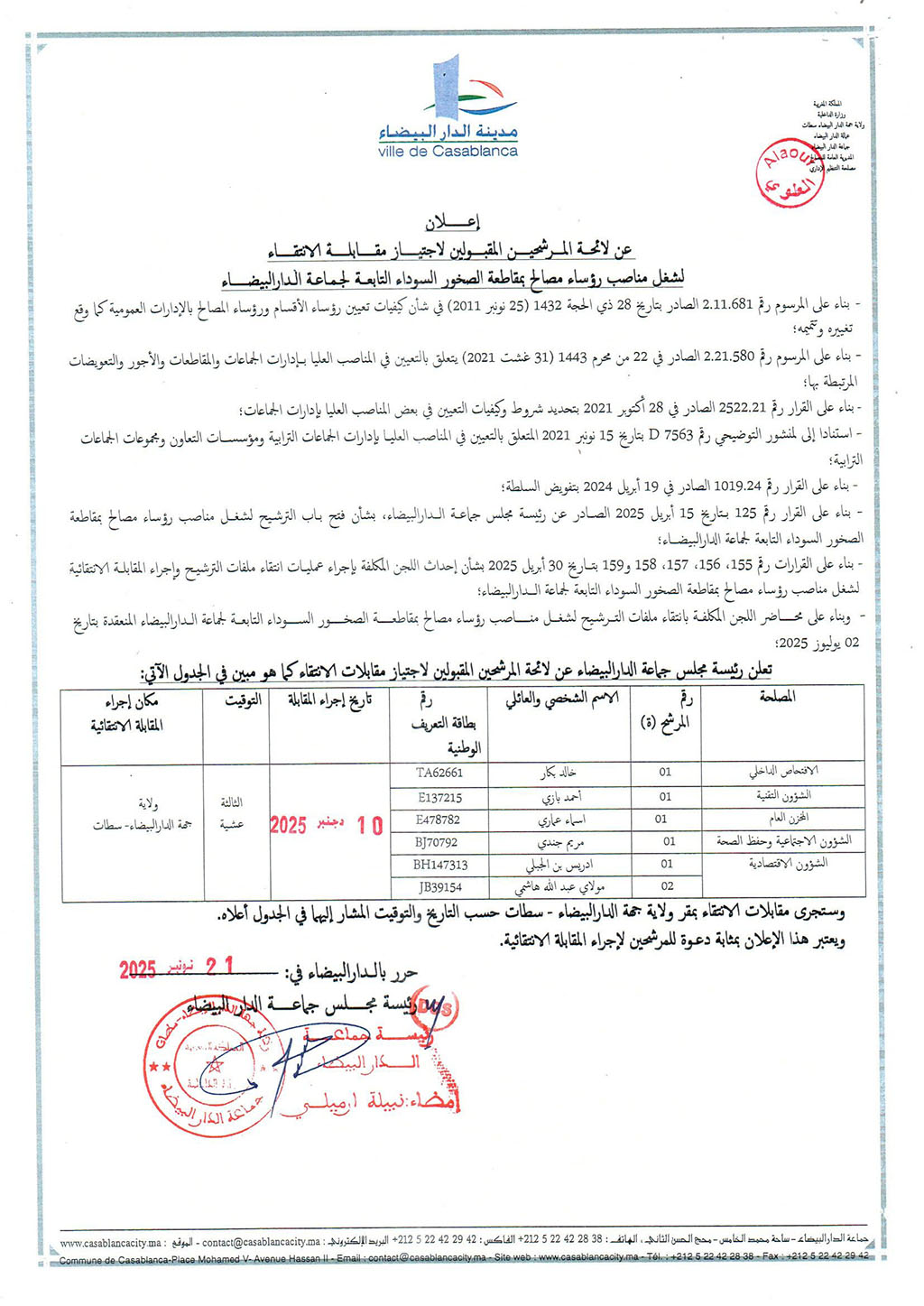 إعلان عن لائحة المرشحين المقبولين لاجتياز مقابلة الانتقاء لشغل مناصب رؤساء مصالح بمقاطعة الصخور السوداء التابعة لجماعة الدار البيضاء