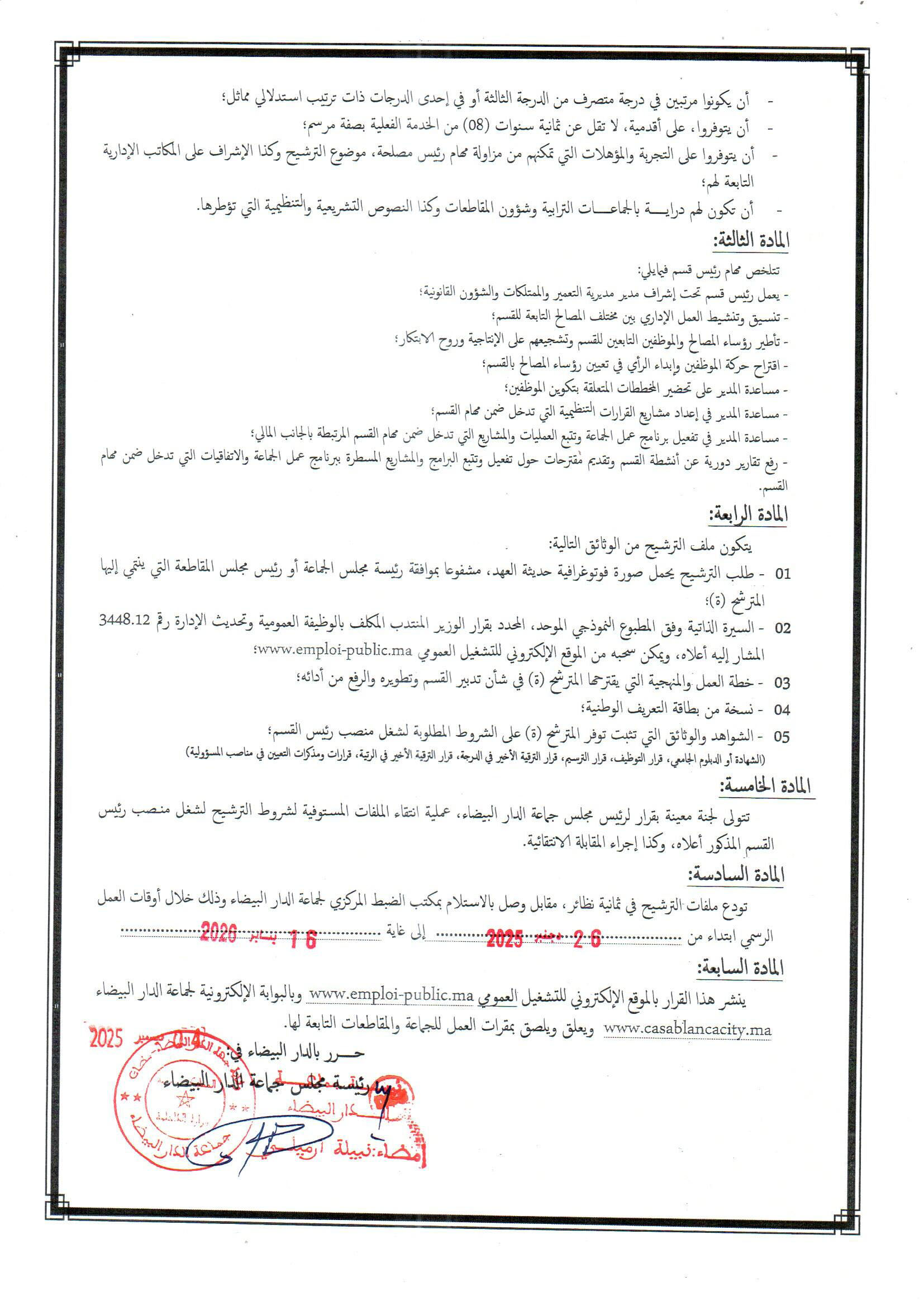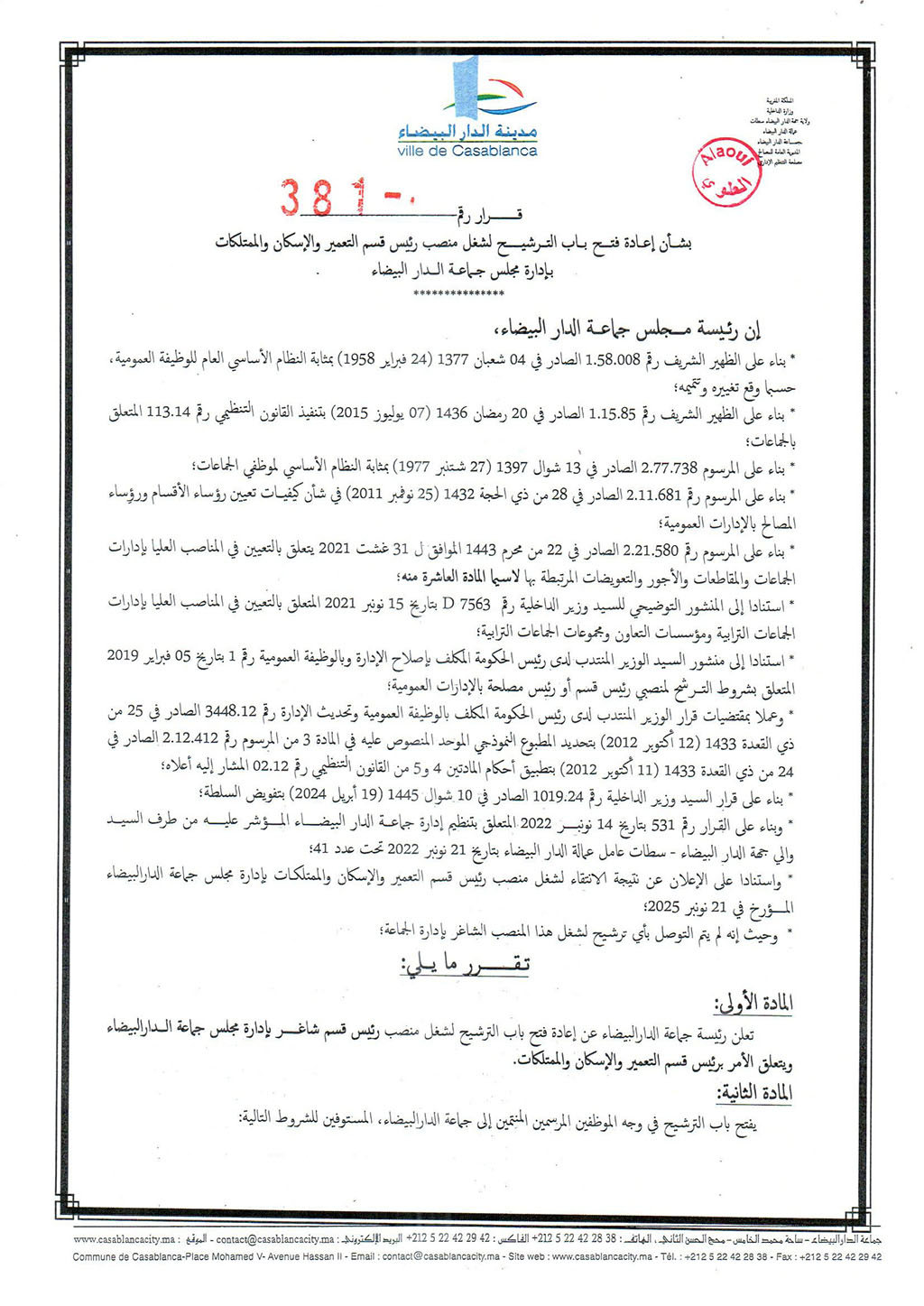 قرار بشأن إعادة فتح باب الترشيح لشغل منصب رئيس قسم التعمير والإسكان والممتلكات بإدارة مجلس جماعة الدار البيضاء