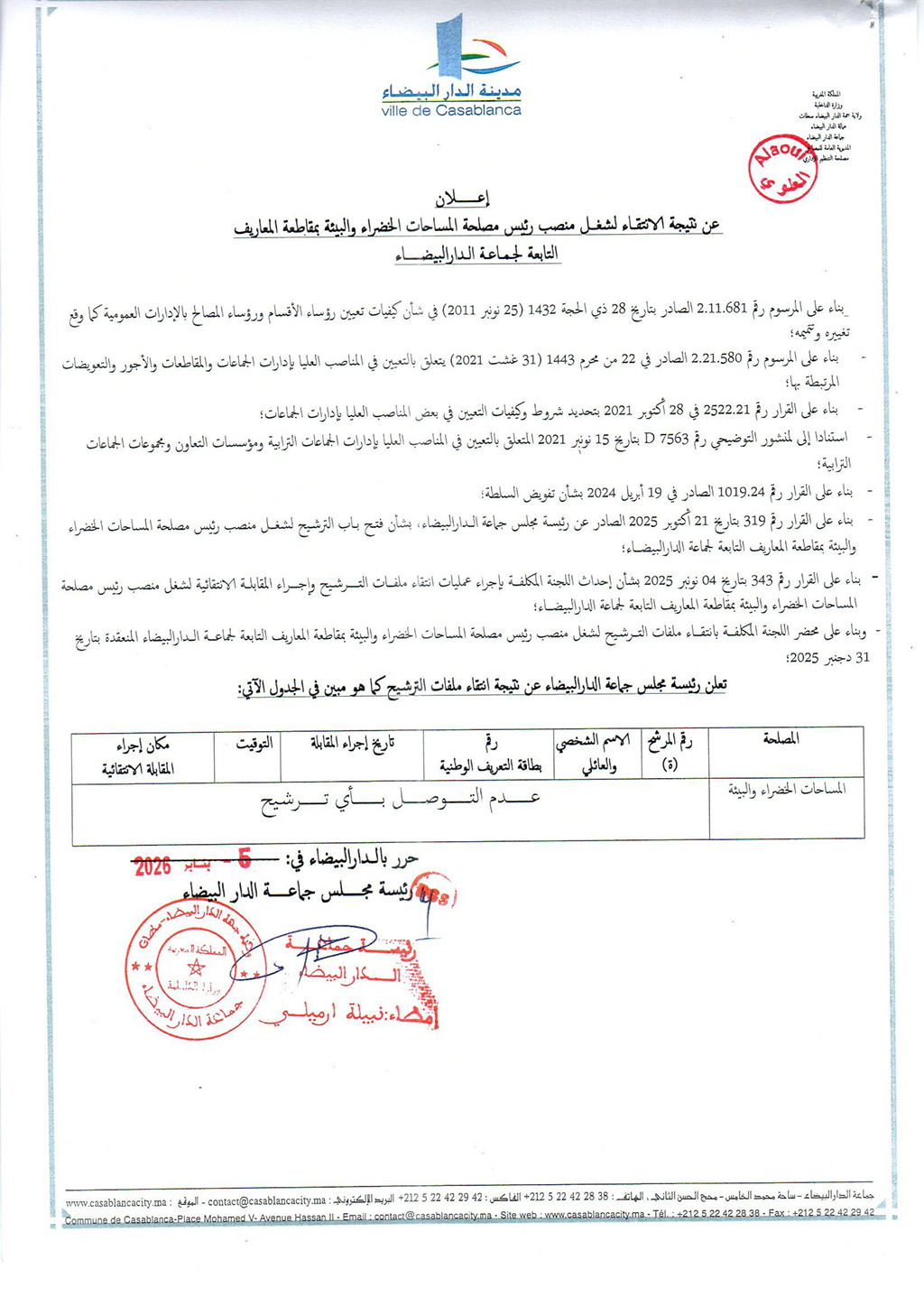 إعلان عن نتيجة الانتقاء لشغل منصب رئيس مصلحة المساحات الخضراء والبيئة بمقاطعة المعاريف التابعة لجماعة الدار البيضاء