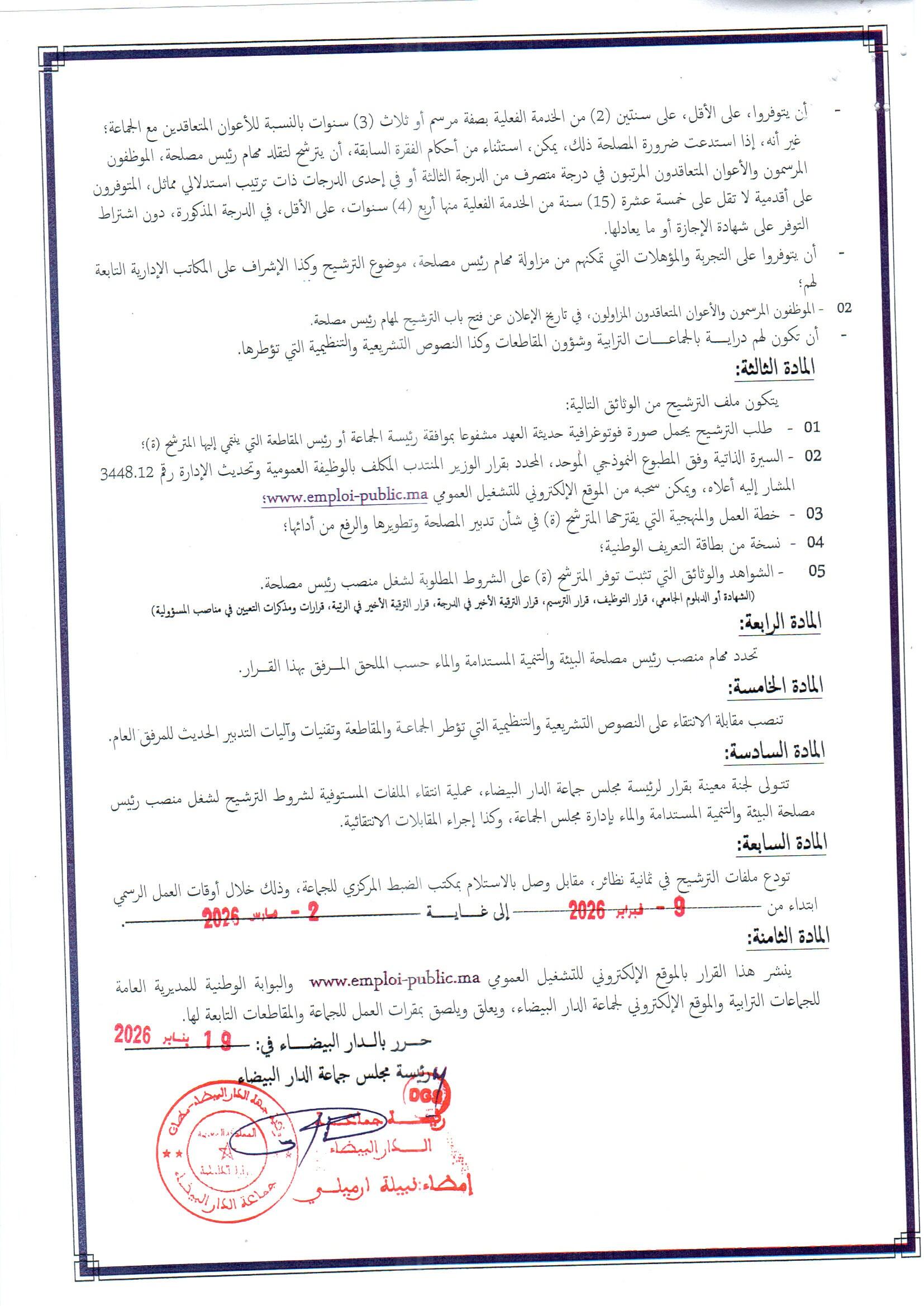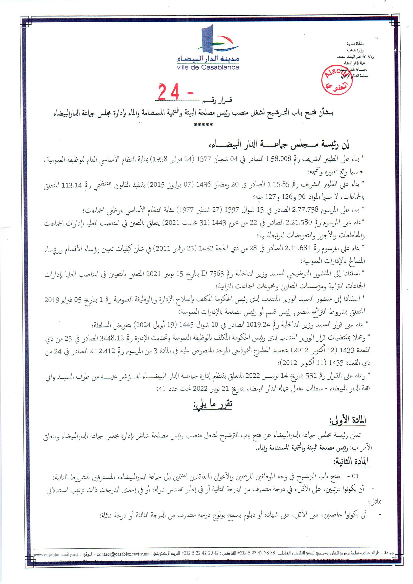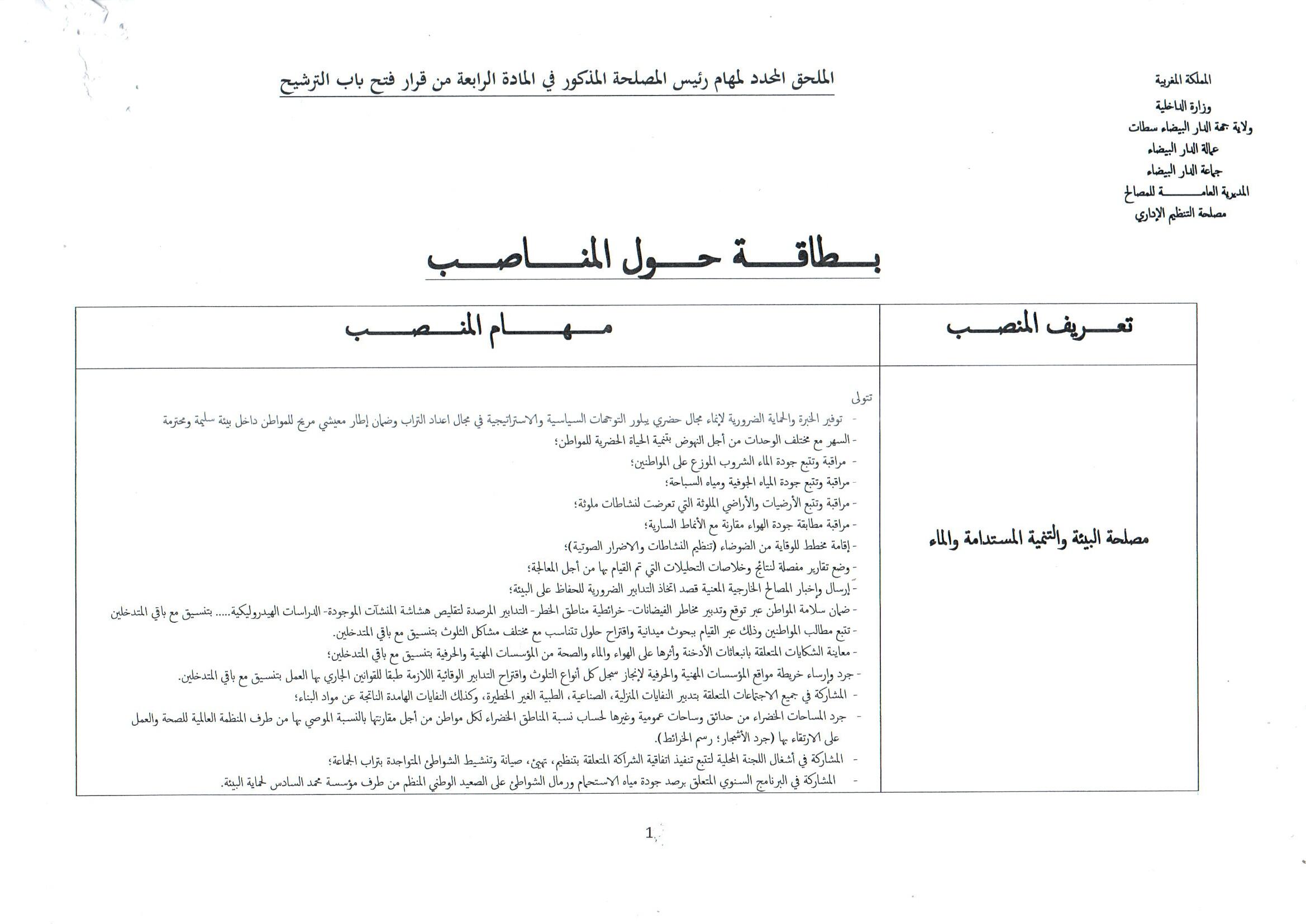 قرار بشأن فتح باب الترشيح لشغل منصب رئيس مصلحة البيئة والتنمية المستدامة والماء بإدارة مجلس جماعة الدار البيضاء
