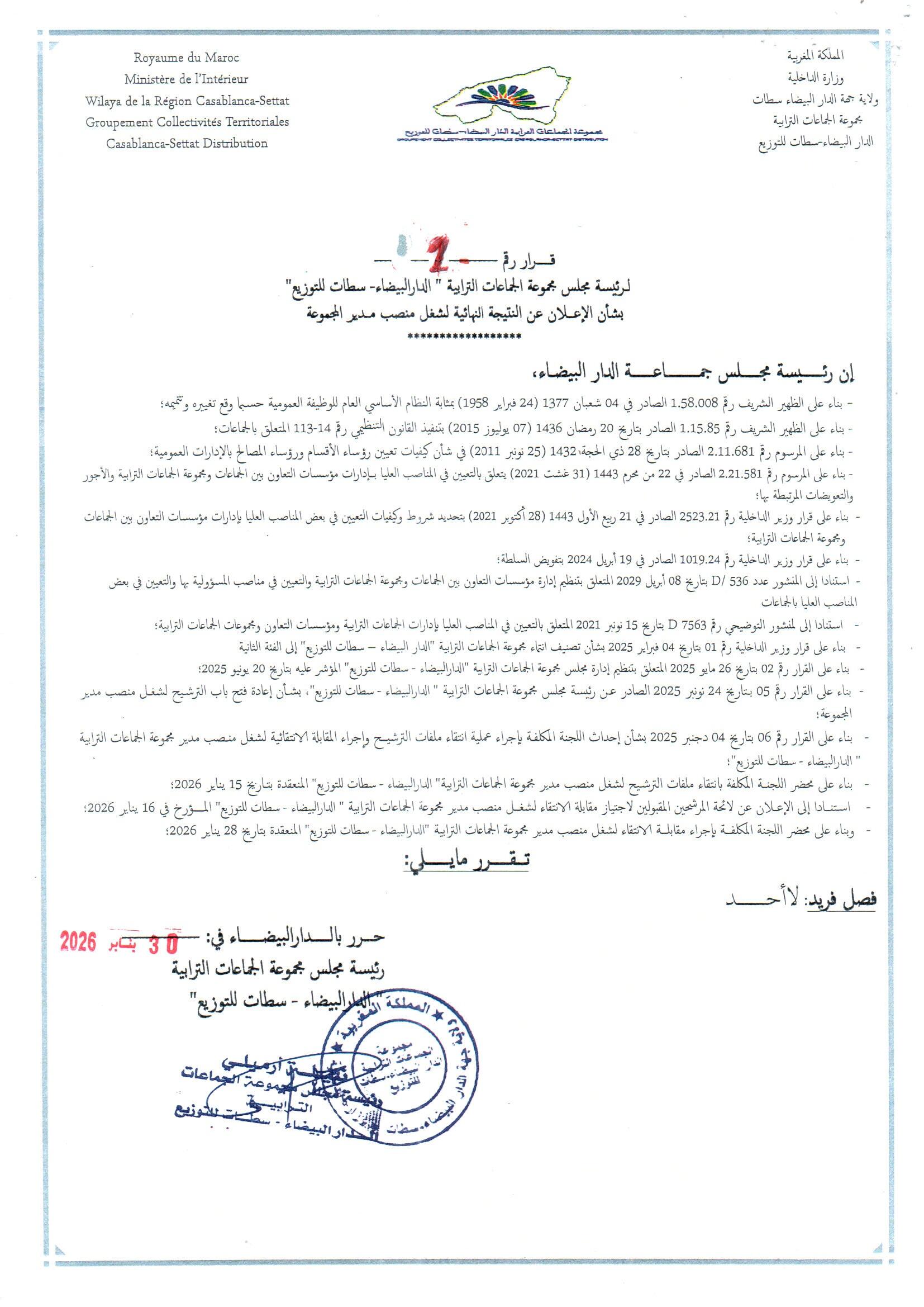 قرار لرئيسة مجلس مجموعة الجماعات الترابية "الدار البيضاء-سطات للتوزيع: بشأن الإعلان عن النتيجة النهائية لشغل منصب مدير المجموعة