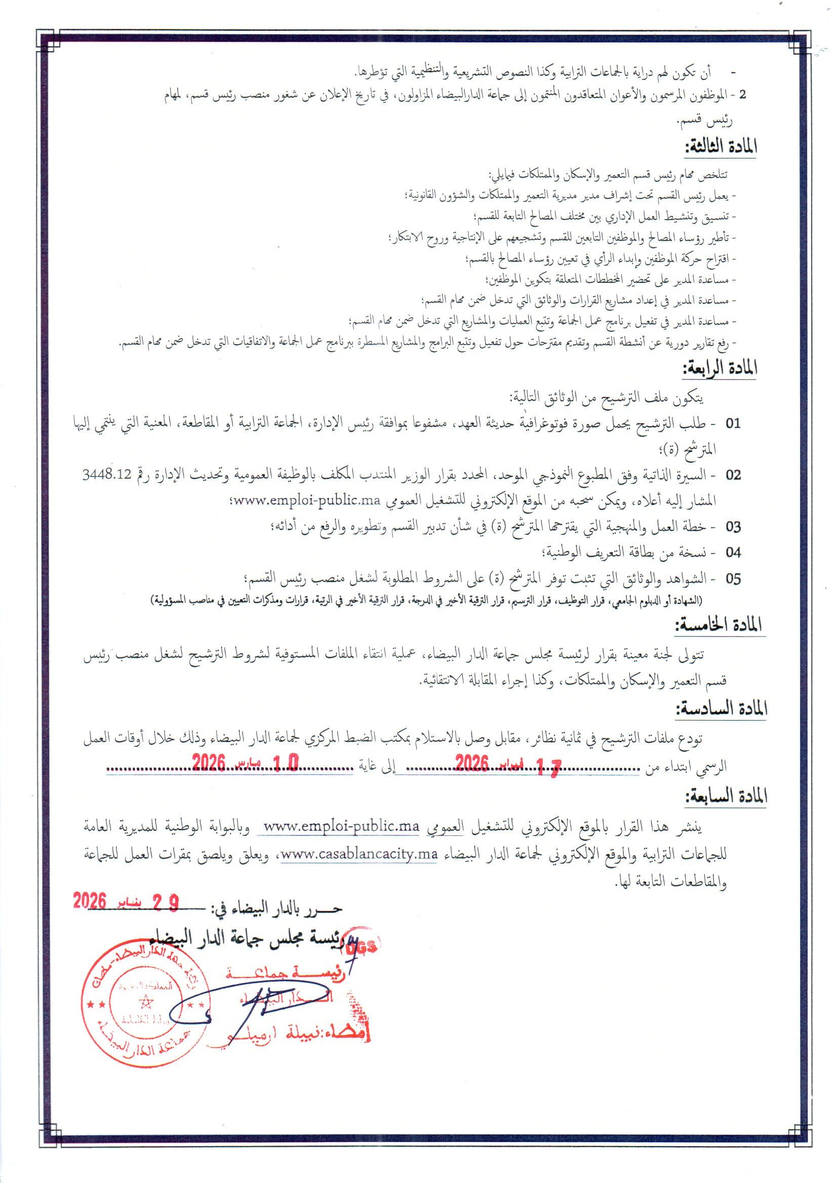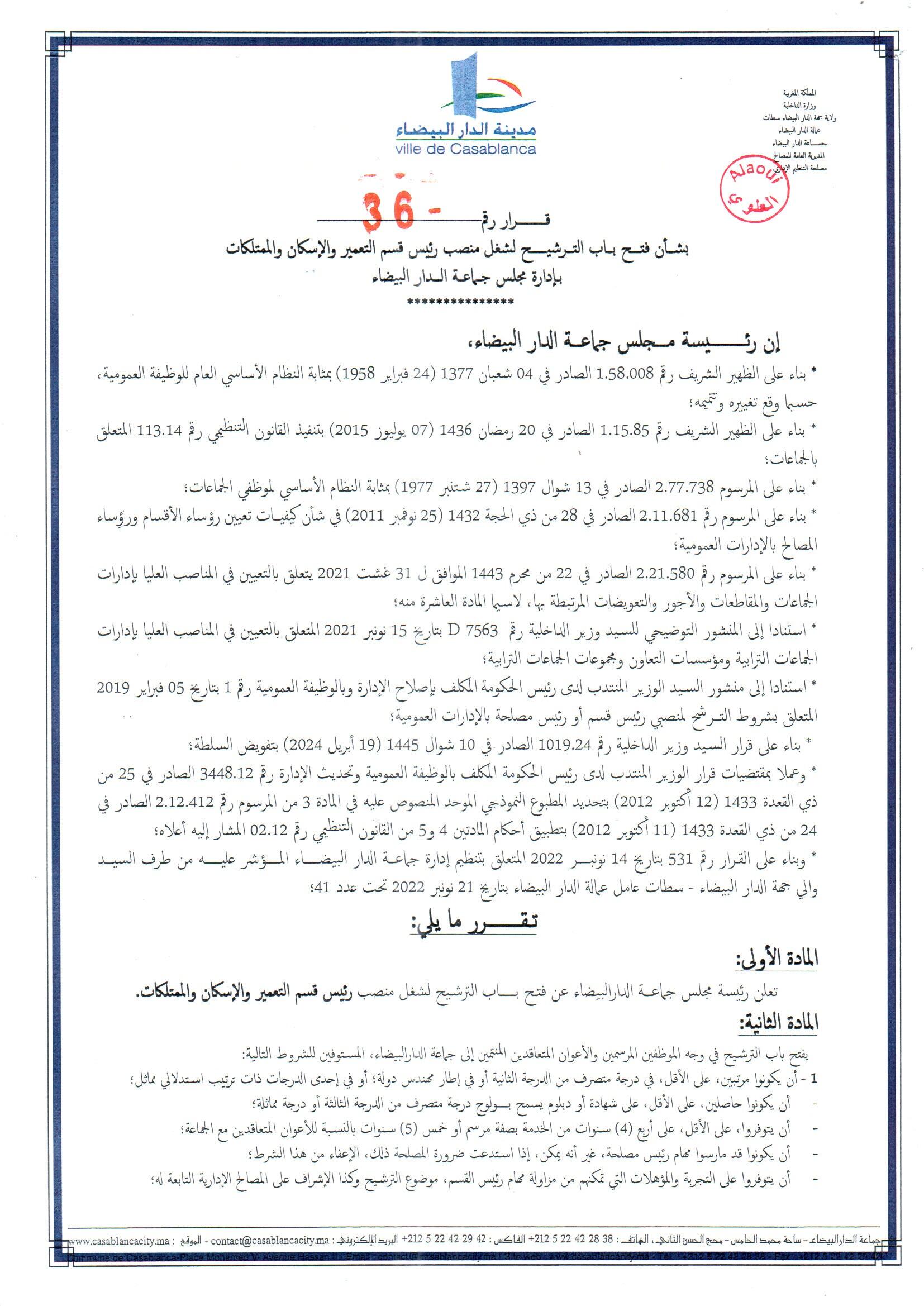 قرار بشأن فتح باب الترشيح لشغل منصب رئيس قسم التعمير و الإسكان و الممتلكات بإدارة مجلس جماعة الدار البيضاء