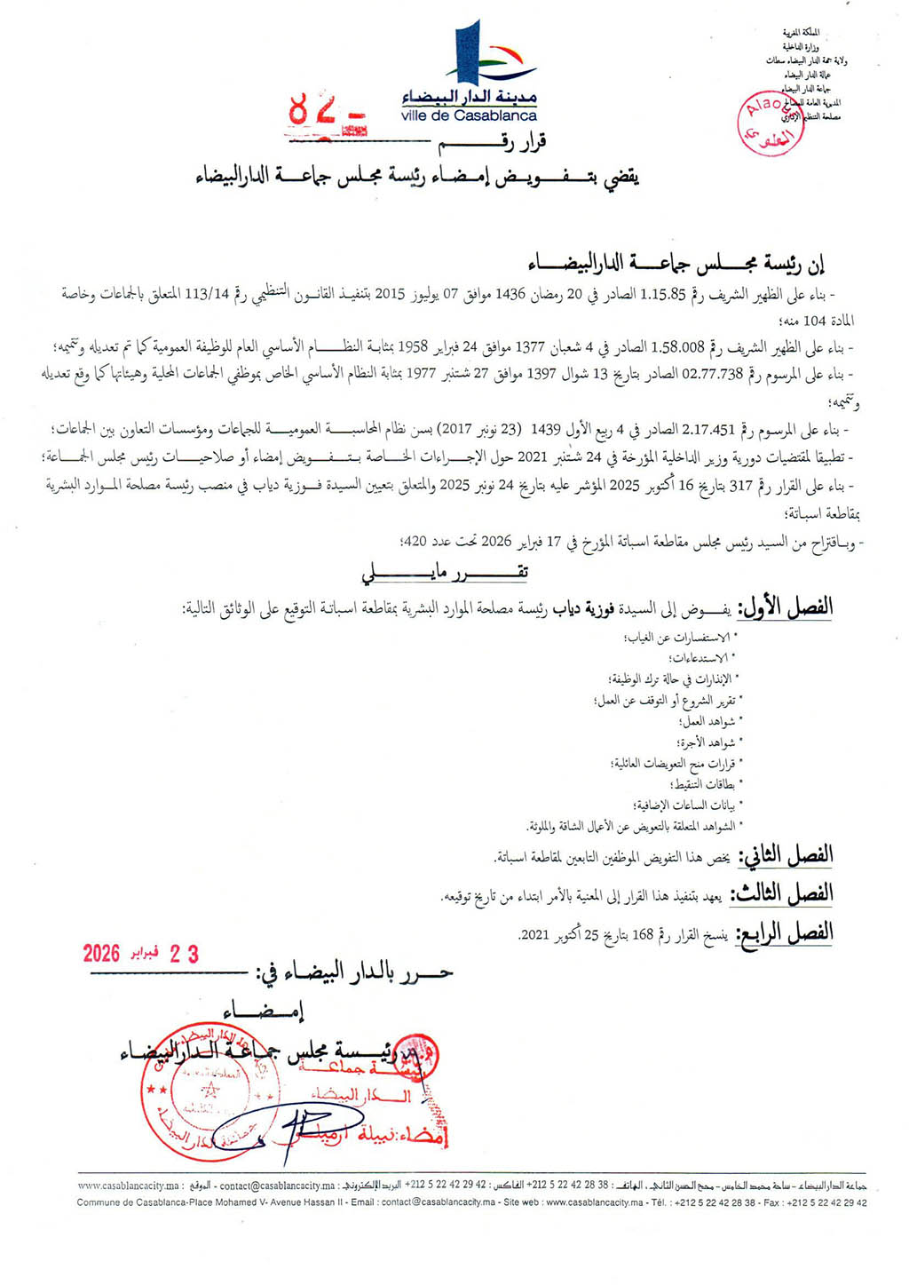 قرار يقضي بتفويض إمضاء رئيسة مجلس جماعة الدار البيضاء