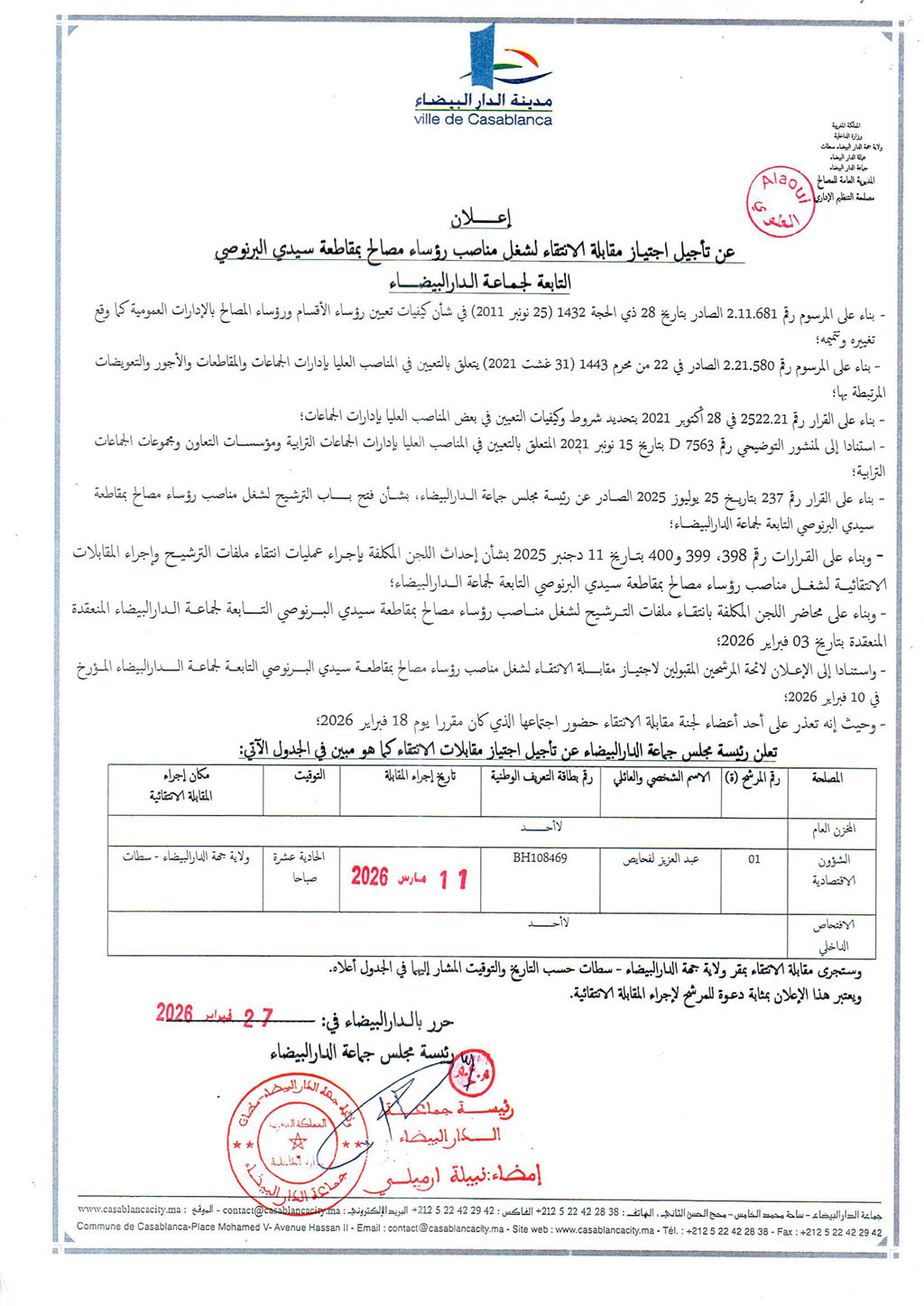 إعلان عن تأجيل اجتياز مقابلة الانتقاء لشغل مناصب رؤساء مصالح بمقاطعة سيدي البرنوصي التابعة لجماعة الدار البيضاء