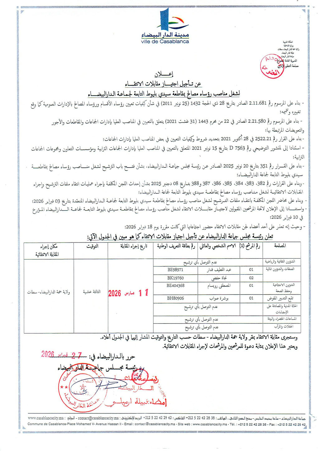 إعلان عن تأجيل اجتياز مقابلات الانتقاء لشغل مناصب رؤساء مصالح بمقاطعة سيدي بليوط التابعة لجماعة الدار البيضاء