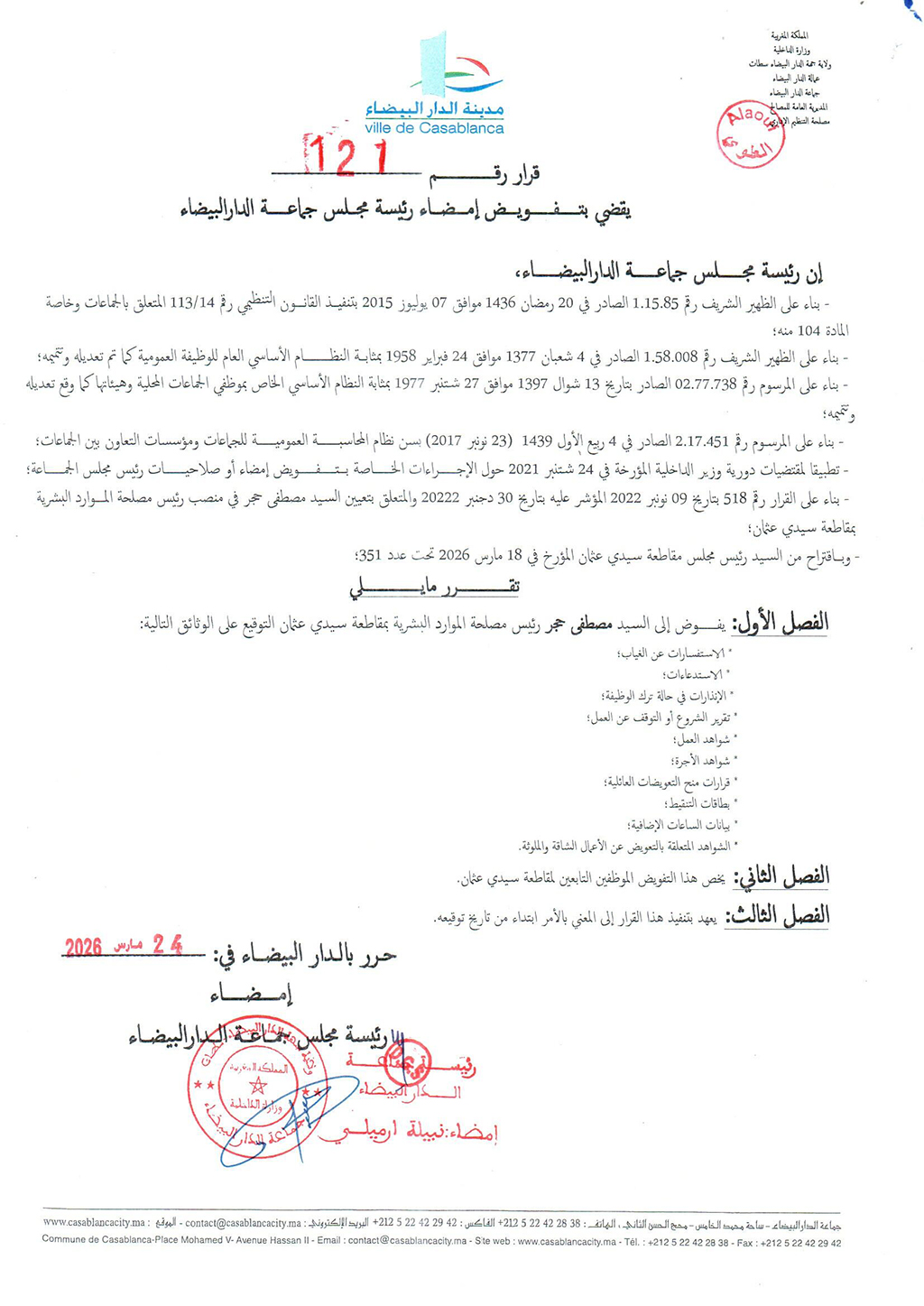 قرار يقضي بتفويض إمضاء رئيسة مجلس جماعة الدار البيضاء