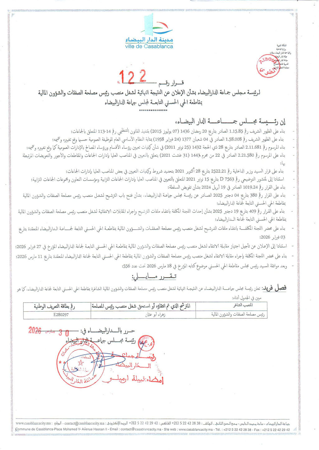 قرار لرئيسة مجلس جماعة الدار البيضاء بشأن الإعلان عن النتيجة النهائية لشغل منصب رئيس مصلحة الصفقات والشؤون المالية بمقاطعة الحي الحسني التابعة لمجلس جماعة الدار البيضاء