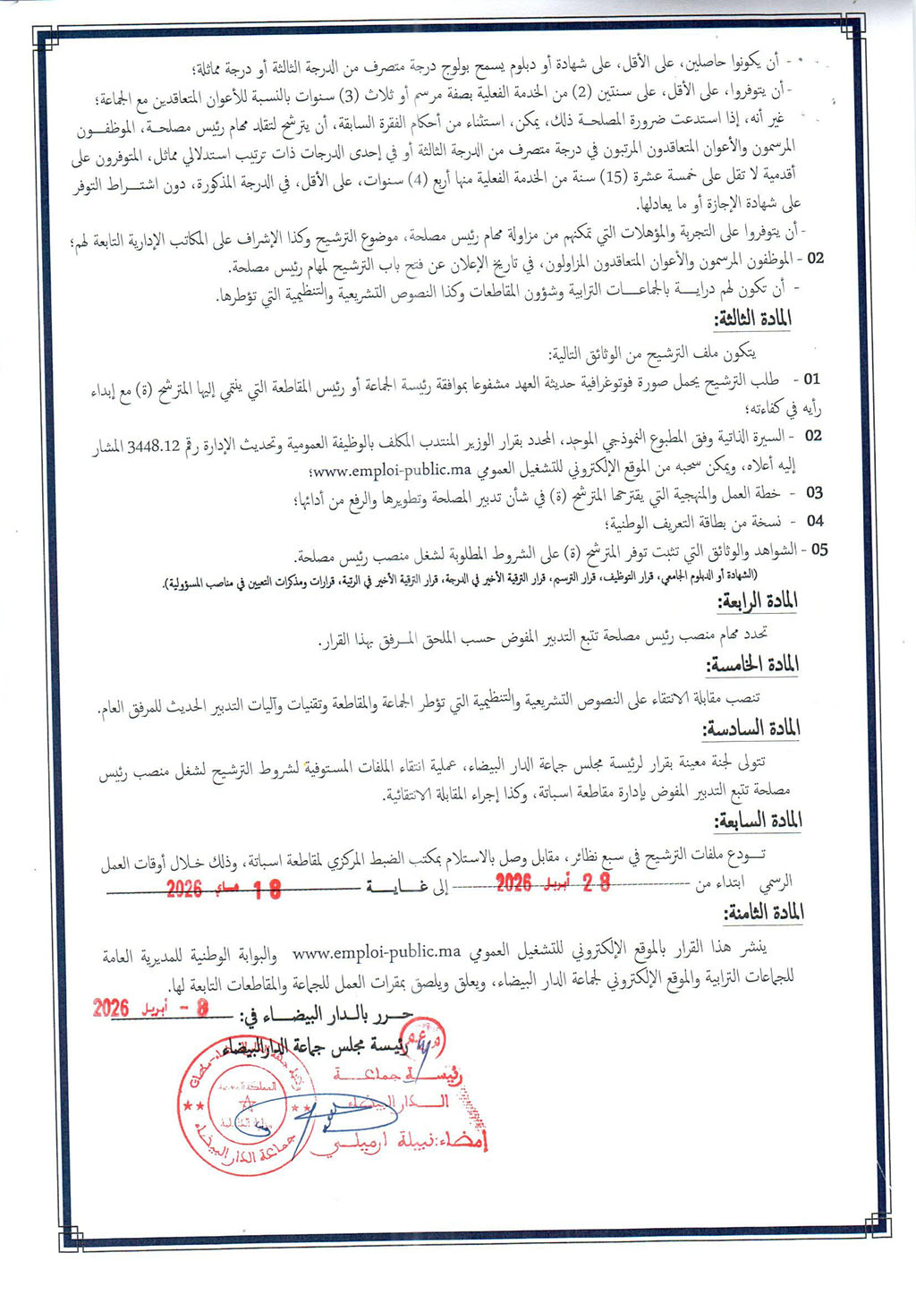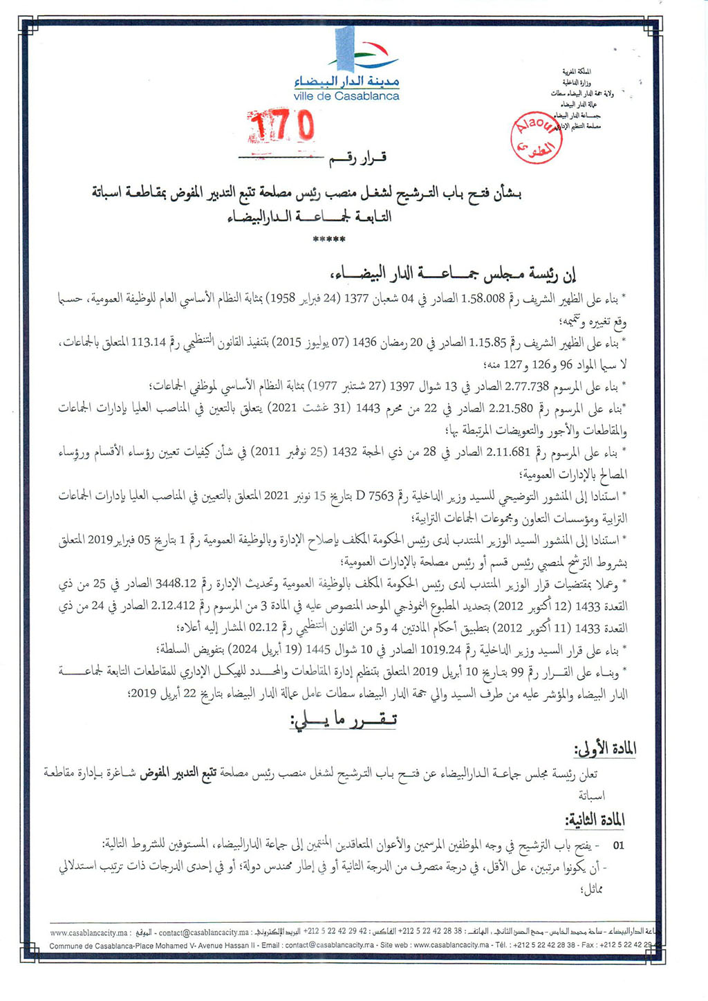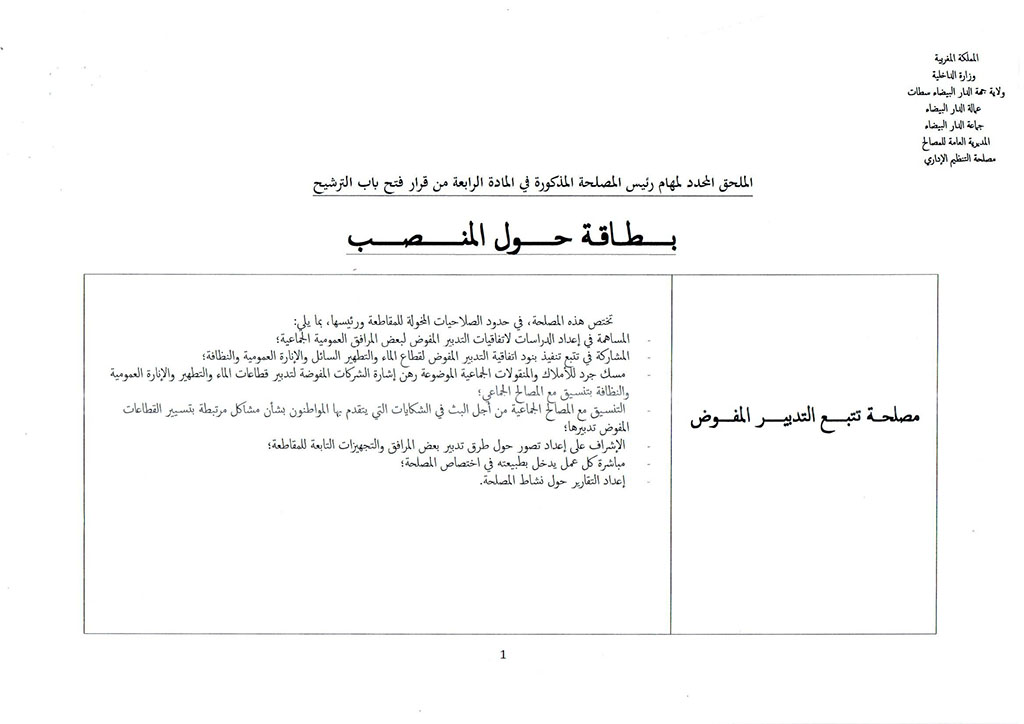 قرار بشأن فتح باب الترشيح لشغل منصب رئيس مصلحة تتبع التدبير المفوض بمقاطعة سباتة التابعة لجماعة الدار البيضاء