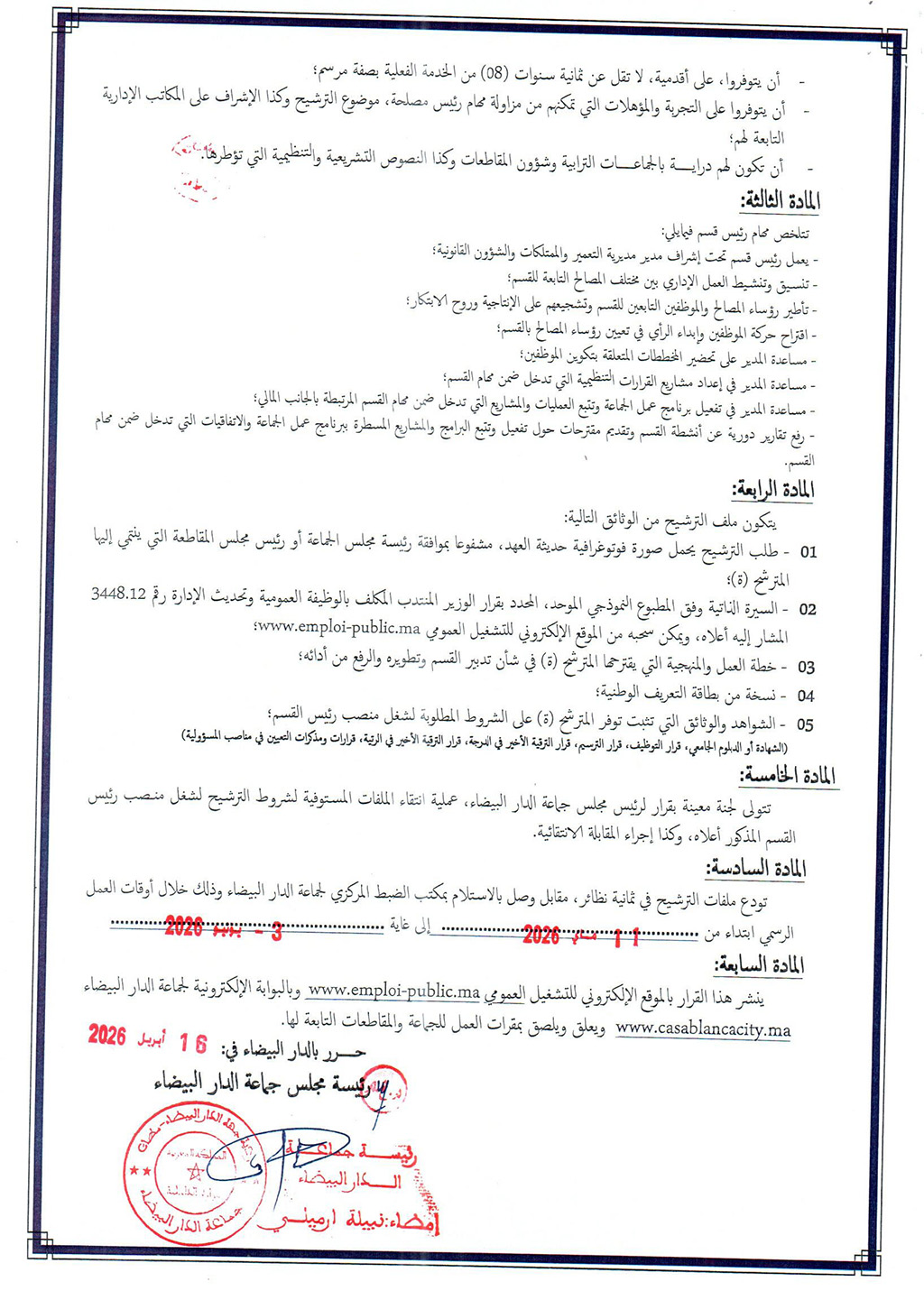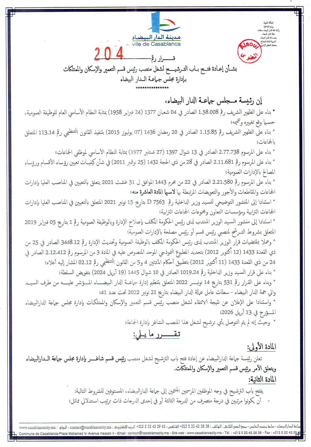 قرار بشأن إعادة فتح باب الترشيح لشغل منصب رئيس قسم التعمير والإسكان والممتلكات بإدارة مجلس جماعة الدار البيضاء