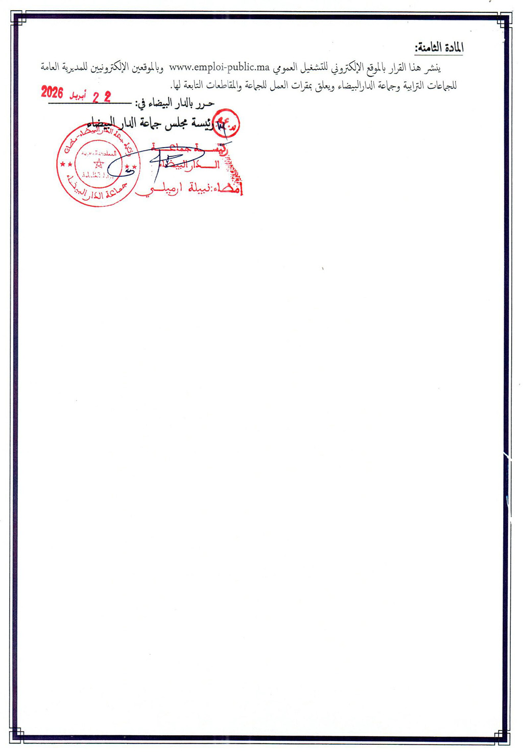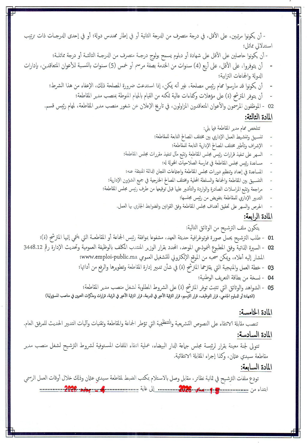 قرار بشأن فتح باب الترشيح لشغل منصب مدير مقاطعة سيدي عثمان التابعة لجماعة الدار البيضاء