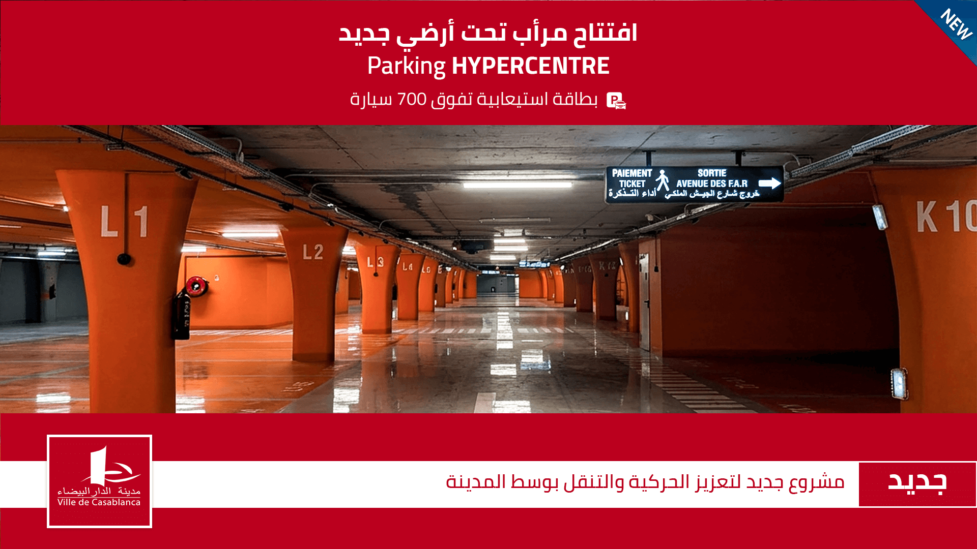 La Commune de Casablanca annonce l'ouverture officielle du nouveau parking souterrain « Hypercentre ». Opérationnel depuis ce samedi 06 décembre 2025, cet ourvage structurant vient répondre aux besoins croissants de stationnement au centre ville.