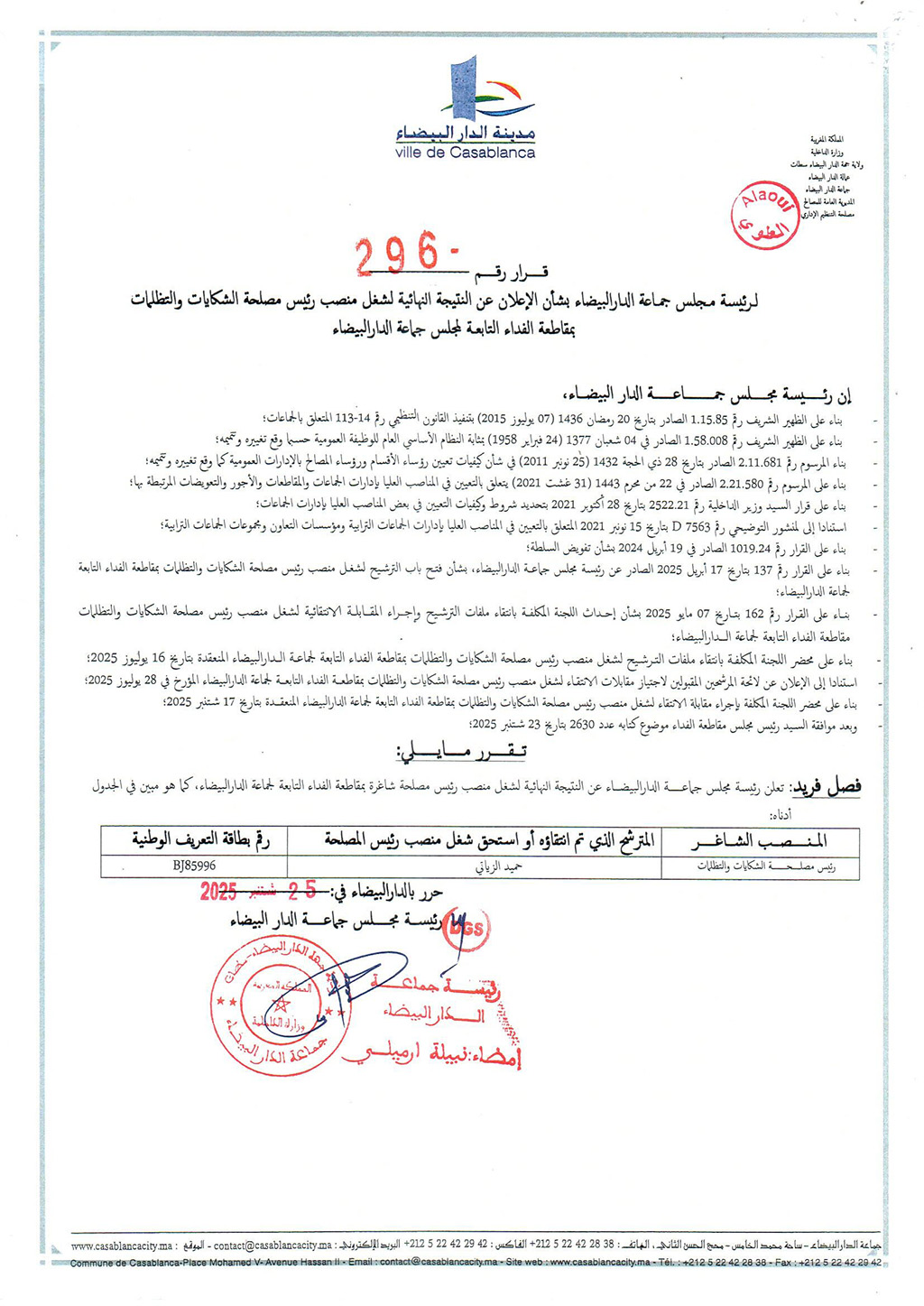 Annoncesقرار لرئيسة مجلس جماعة الدار البيضاء بشأن الإعلان عن النتيجة النهائية لشغل منصب رئيس مصلحة الشكايات والتظلمات بمقاطعة الفداء التابعة لمجلس جماعة الدار البيضاء