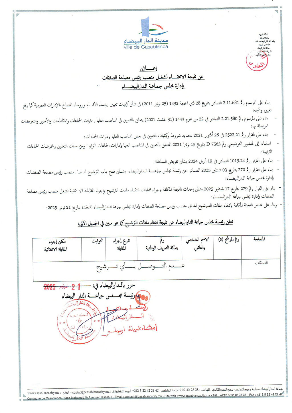 Casablanca Annonces إعلان عن نتيجة الانتقاء لشغل منصب رئيس مصلحة الصفقات بإدارة مجلس جماعة الدار البيضاء