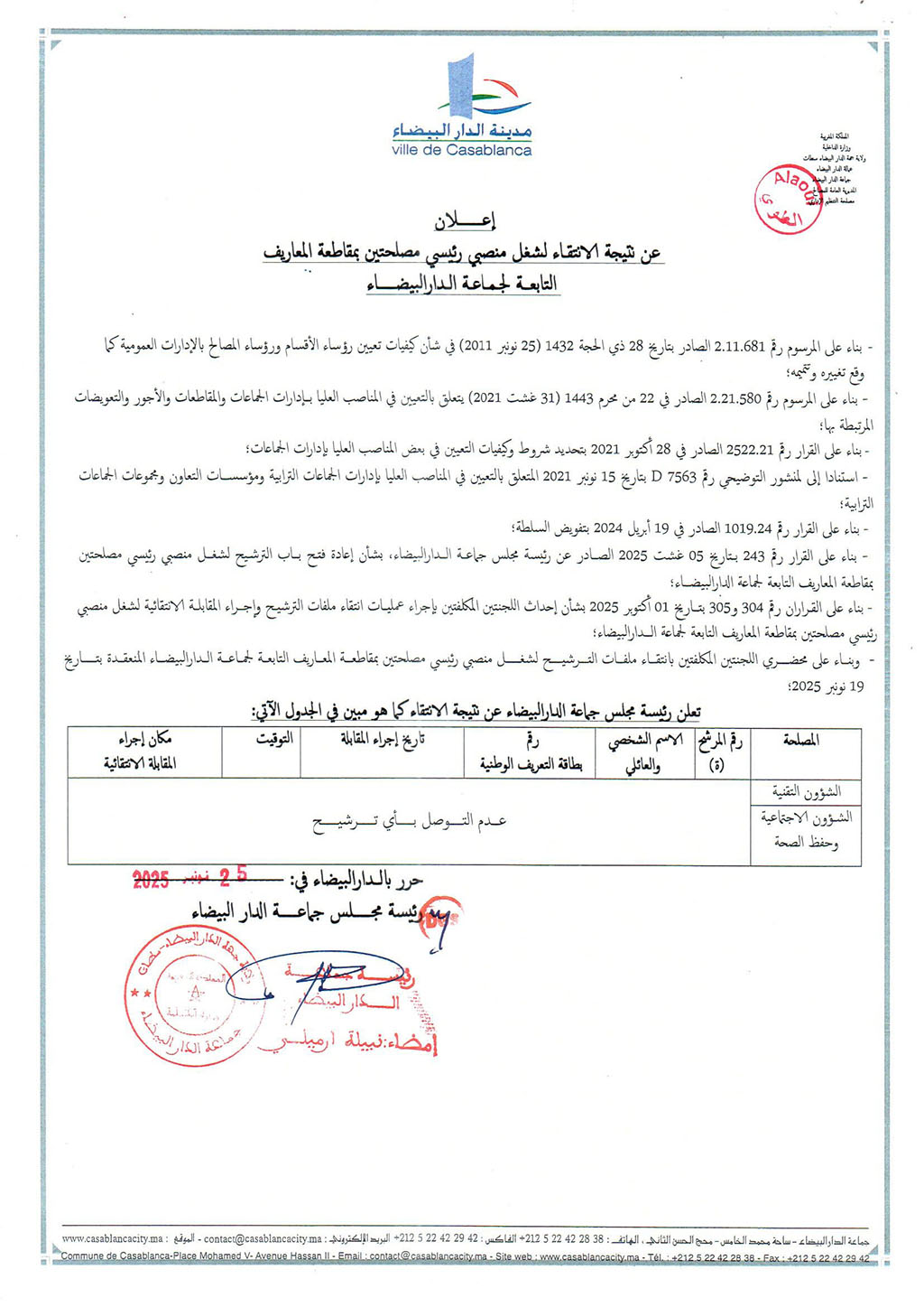 Casablanca Annonces إعلان عن نتيجة الانتقاء لشغل منصبي رئيسي مصلحتين بمقاطعة المعاريف التابعة لجماعة الدار البيضاء