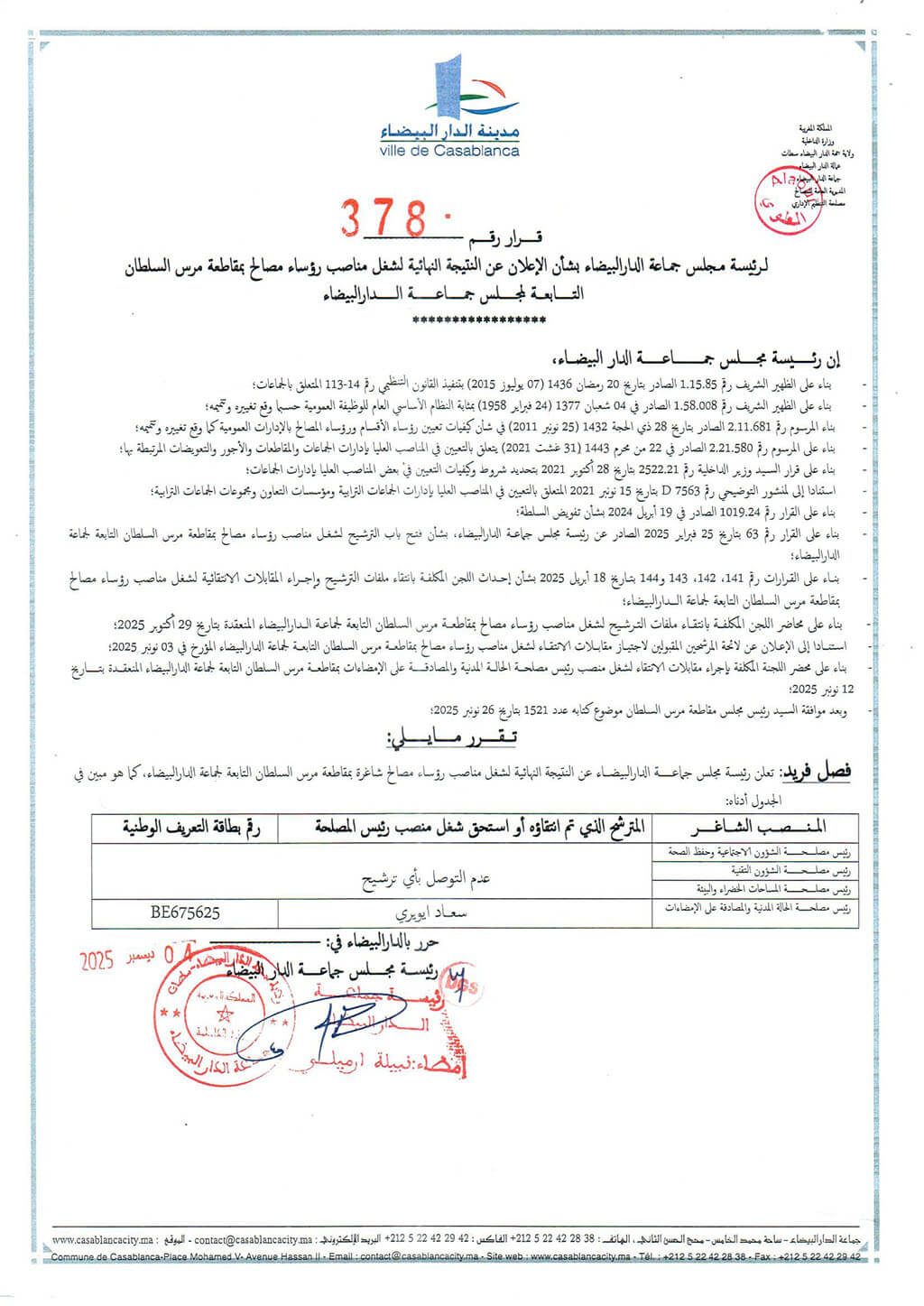 قرار لرئيسة مجلس جماعة الدار البيضاء بشأن الإعلان عن النتيجة النهائية لشغل مناصب رؤساء مصالح بمقاطعة مرس السلطان التابعة لمجلس جماعة الدار البيضاء