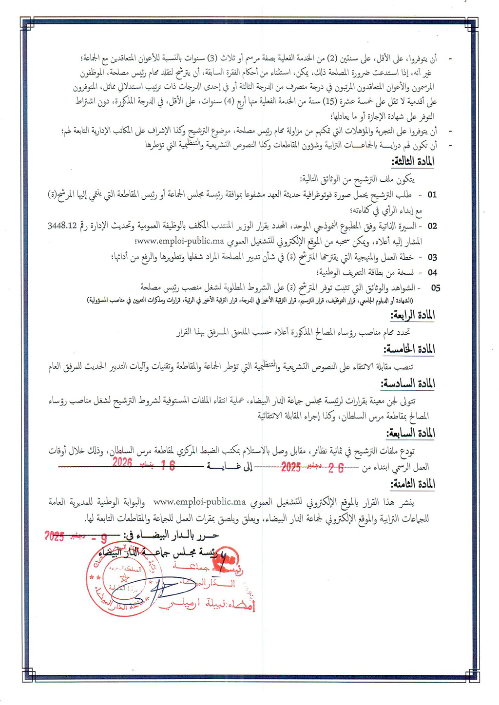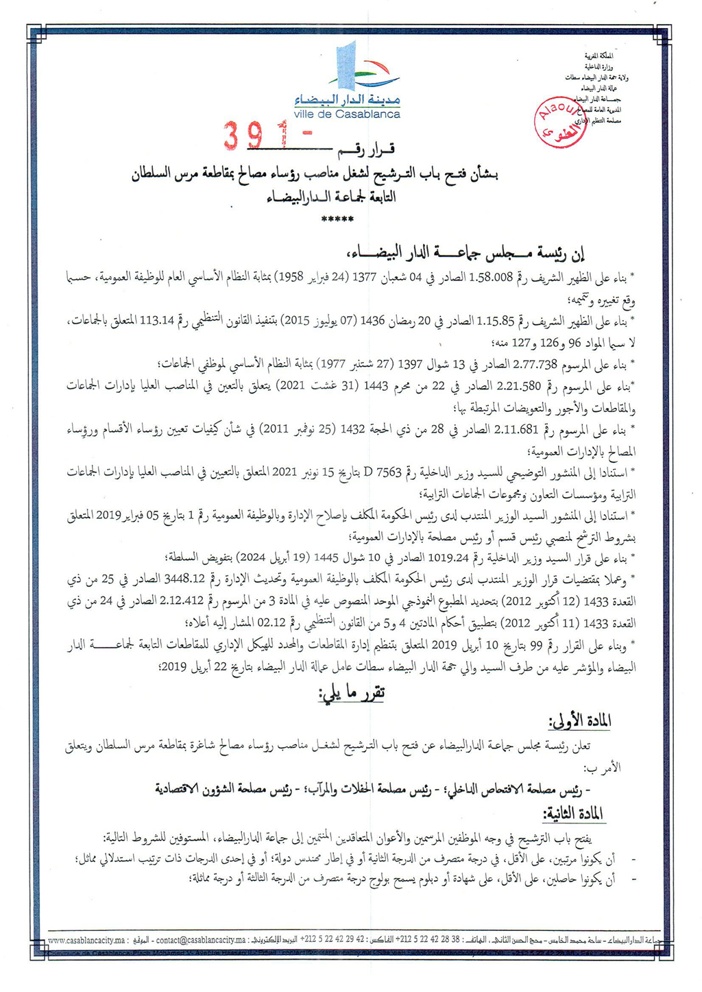 Casablanca Annonces قرار بشأن فتح باب الترشيح لشغل مناصب رؤساء مصالح بمقاطعة مرس السلطان التابعة لجماعة الدار البيضاء