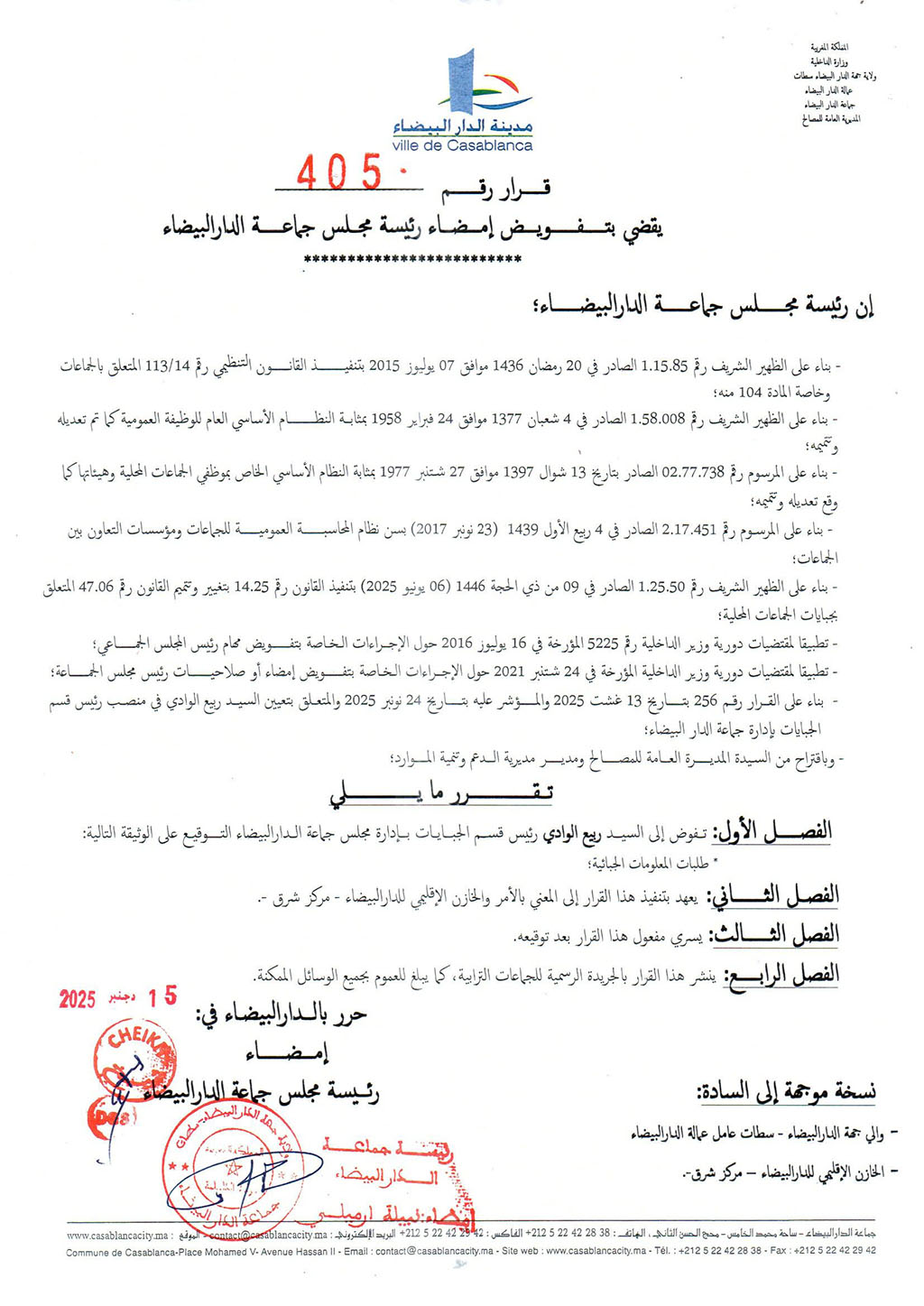 Casablanca Annonces قرار يقضي بتفويض إمضاء رئيسة مجلس جماعة الدار البيضاء