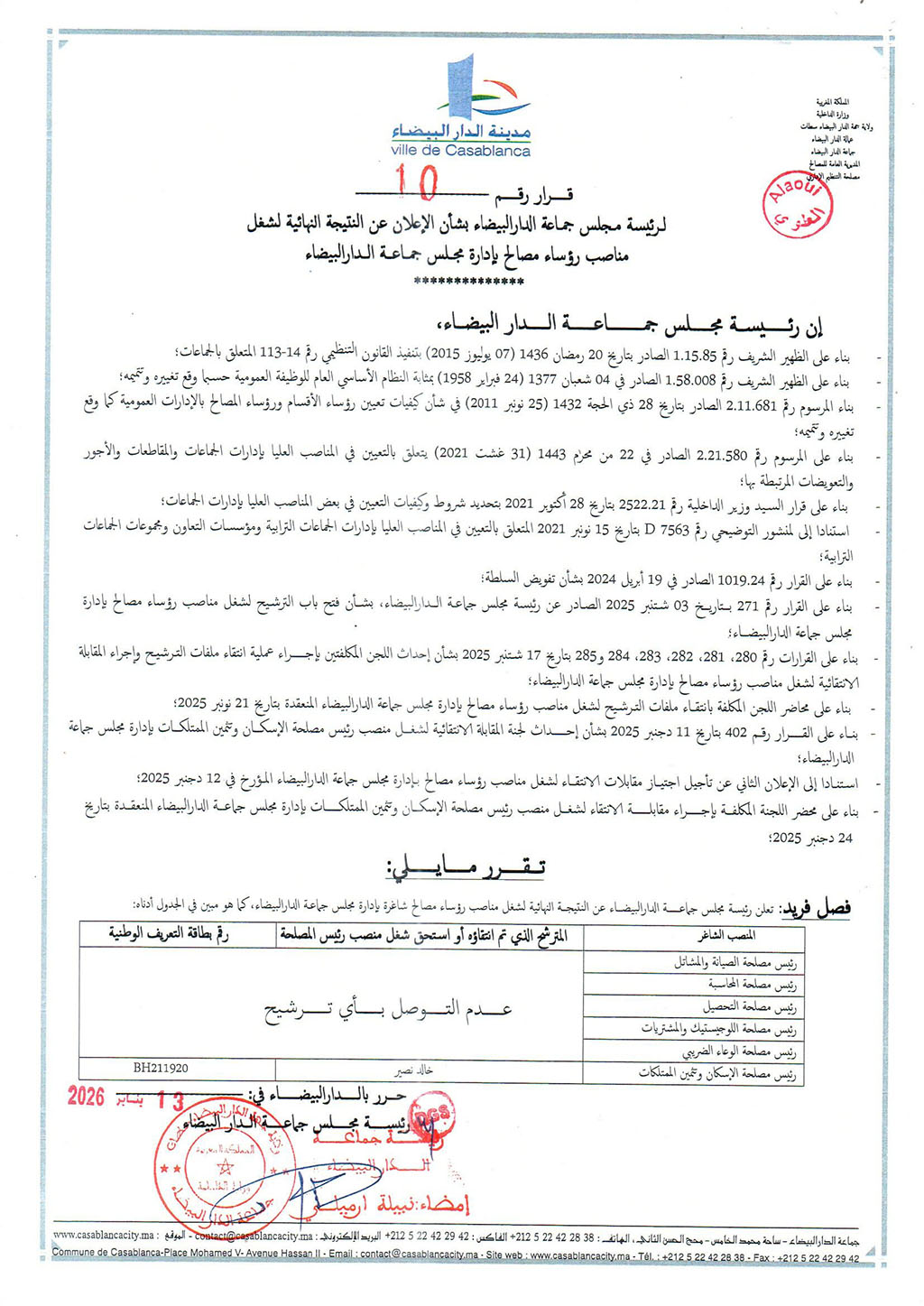 قرار لرئيسة مجلس جماعة الدار البيضاء بشأن الإعلان عن النتيجة النهائية لشغل مناصب رؤساء مصالح بإدارة مجلس جماعة الدار البيضاء
