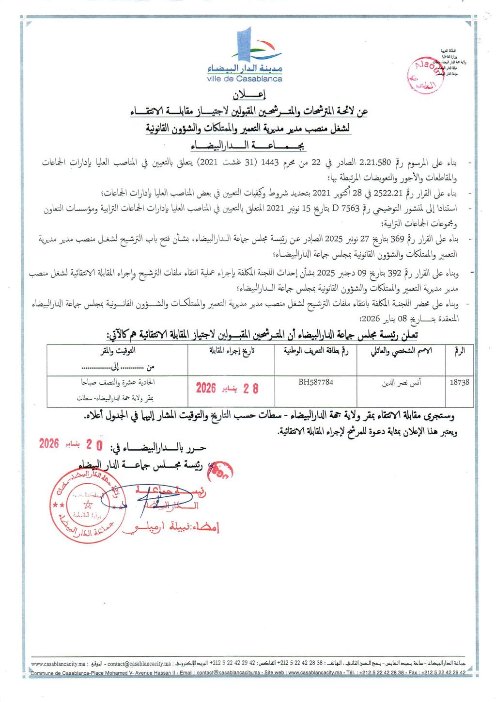 Annoncesإعلان عن لائحة المترشحات والمترشحين المقبولين لاجتياز مقابلة الانتقاء لشغل منصب مدير مديرية التعمير والممتلكات والشؤون القانونية بجماعة الدار البيضاء