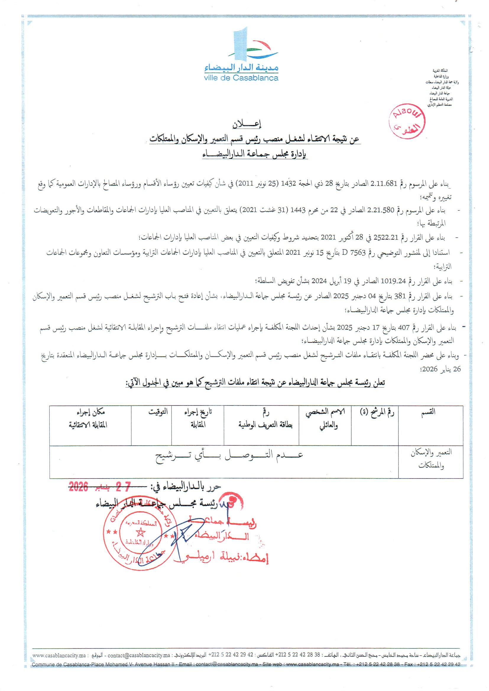 Casablanca Annonces إعلان عن نتيجة الانتقاء لشغل منصب رئيس قسم التعمير والإسكان والممتلكات بإدارة مجلس جماعة الدار البيضاء
