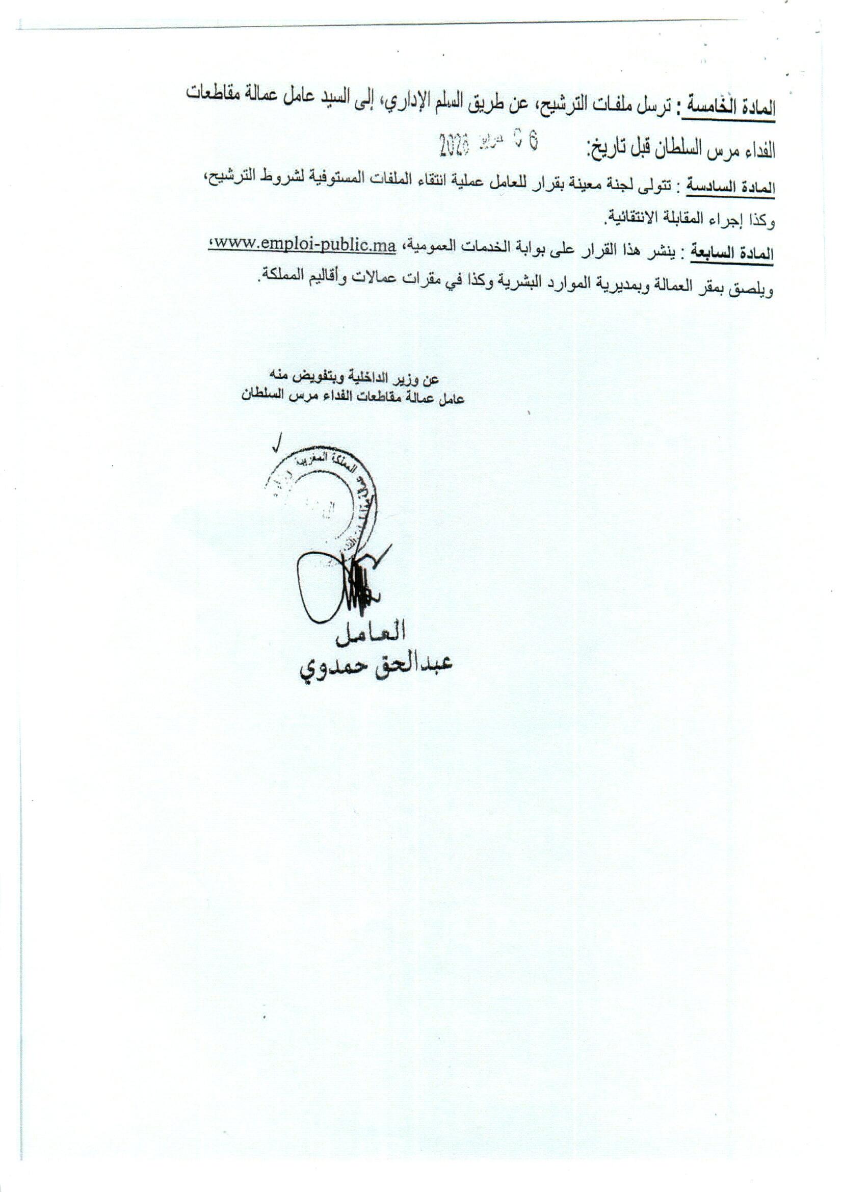 قرار بشأن إعادة فتح باب الترشيح لشغل مناصب المسؤولية الشاغرة بعمالة مقاطعات الفداء مرس السلطان