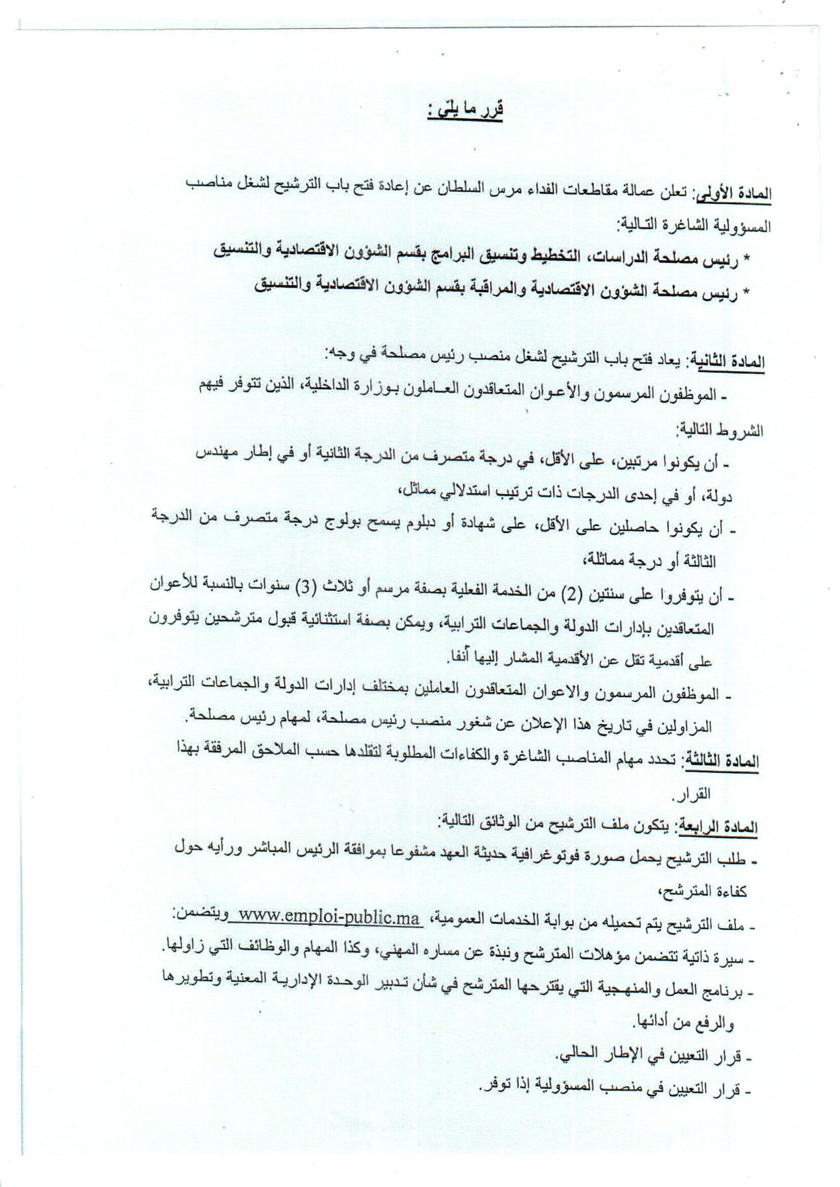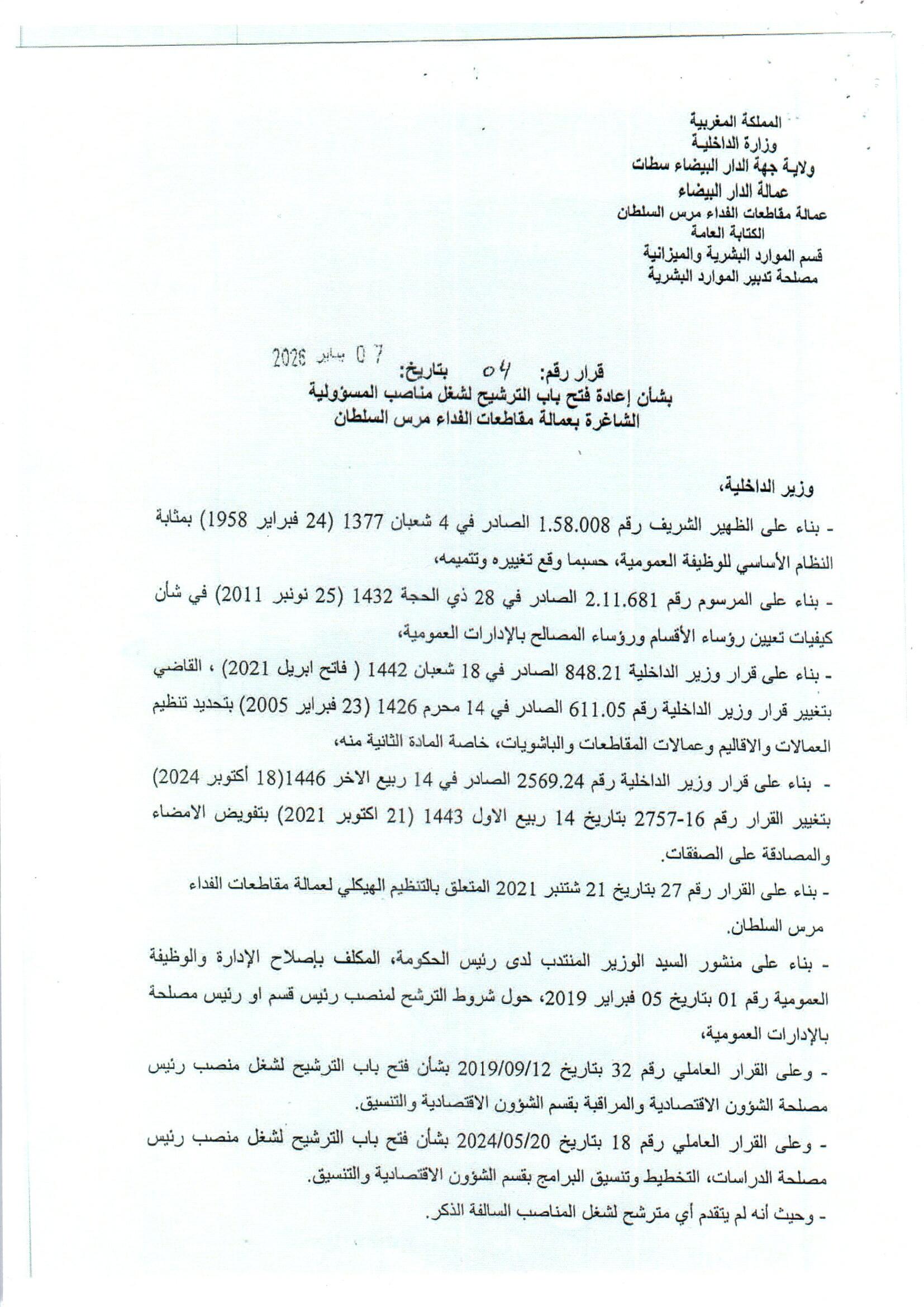 Casablanca Annonces قرار بشأن إعادة فتح باب الترشيح لشغل مناصب المسؤولية الشاغرة بعمالة مقاطعات الفداء مرس السلطان