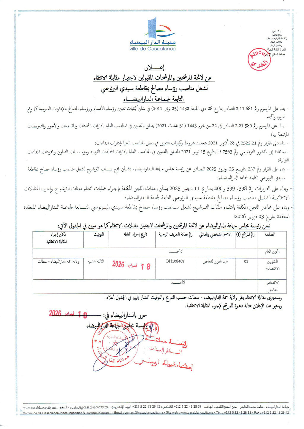 إعلان عن لائحة المرشحين والمرشحات المقبولين لاجتياز مقابلة الانتقاء لشغل مناصب رؤساء مصالح بمقاطعة سيدي البرنوصي التابعة لجماعة الدار البيضاء