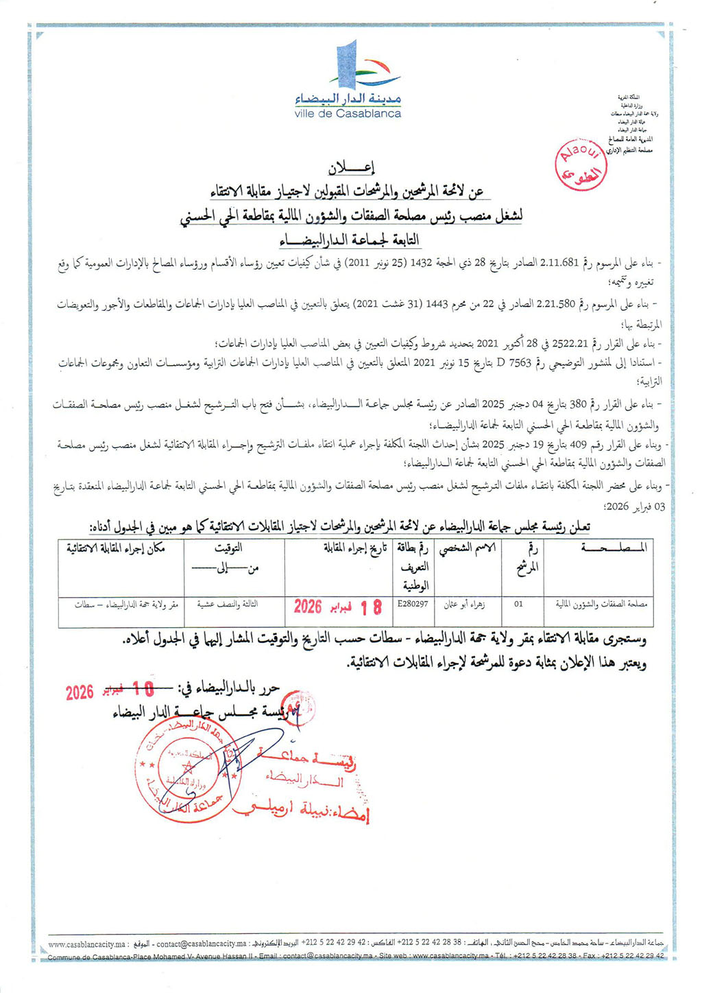 Annoncesإعلان عن لائحة المرشحين والمرشحات المقبولين لاجتياز مقابلة الانتقاء لشغل مناصب رؤساء مصالح بمقاطعة سيدي بليوط التابعة لجماعة الدار البيضاء