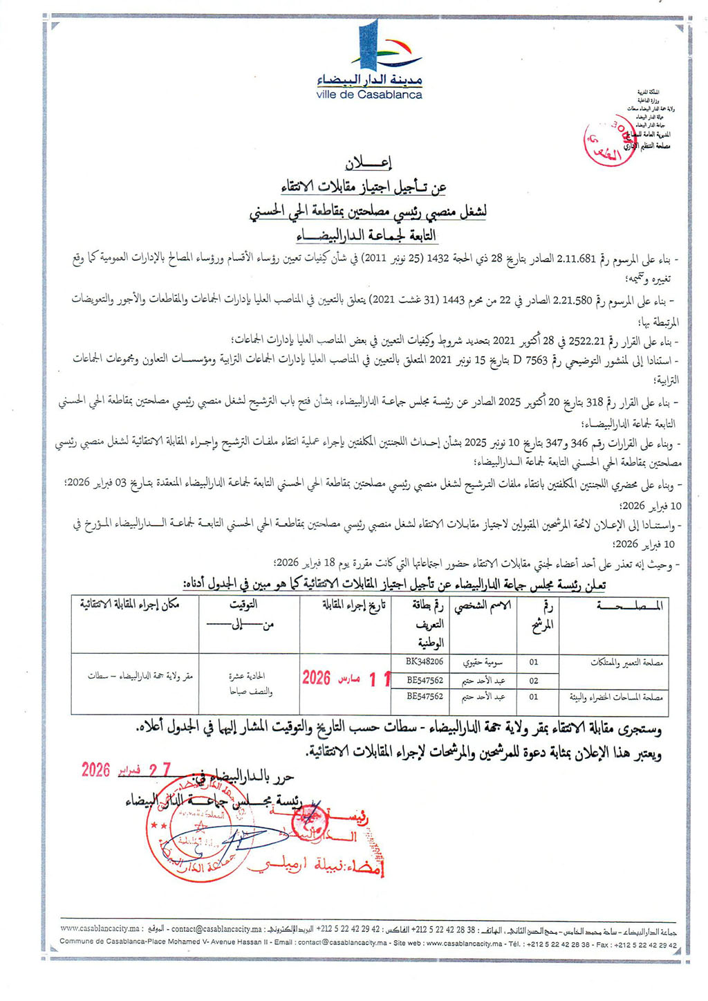Casablanca Annonces إعلان عن تأجيل اجتياز مقابلة الانتقاء لشغل منصبي رئيسي مصلحتين بمقاطعة الحي الحسني التابعة لجماعة الدار البيضاء