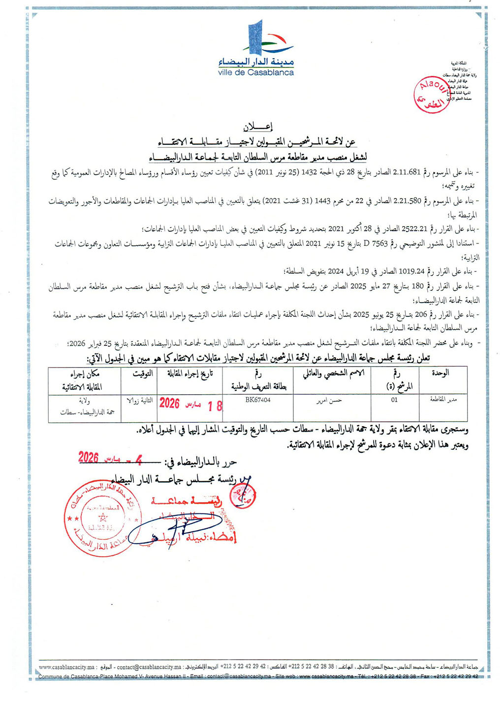 إعلان عن لائحة المرشحين المقبولين لاجتياز مقابلة الانتقاء لشغل منصب مدير مقاطعة مرس السلطان التابعة لجماعة الدار البيضاء