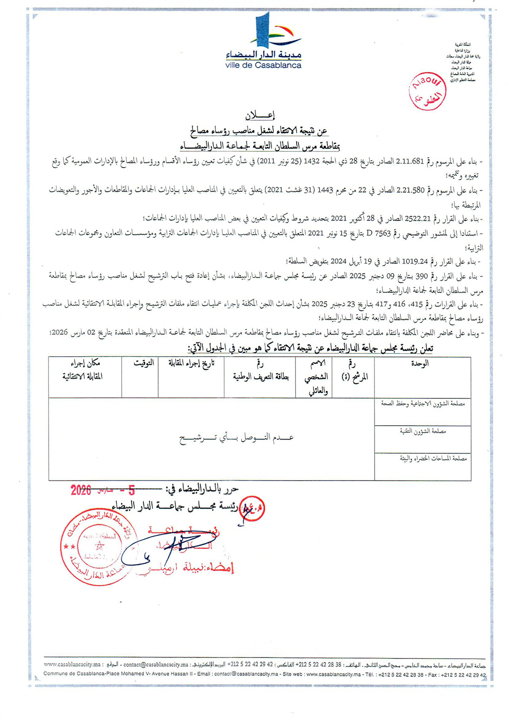 Casablanca Annonces إعلان عن نتيجة الانتقاء لشغل مناصب رؤساء مصالح بمقاطعة مرس السلطان التابعة لجماعة الدار البيضاء