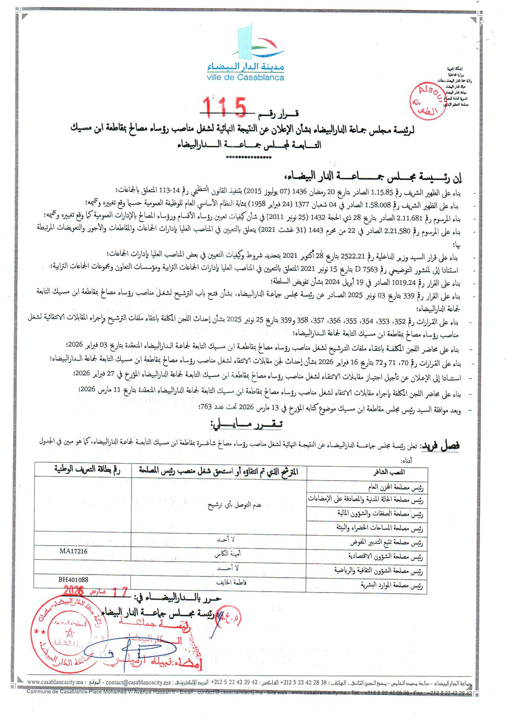 قرار لرئيسة مجلس جماعة الدار البيضاء بشأن الإعلان عن النتيجة النهائية لشغل مناصب رؤساء مصالح بمقاطعة ابن مسيك التابعة لمجلس جماعة الدار البيضاء