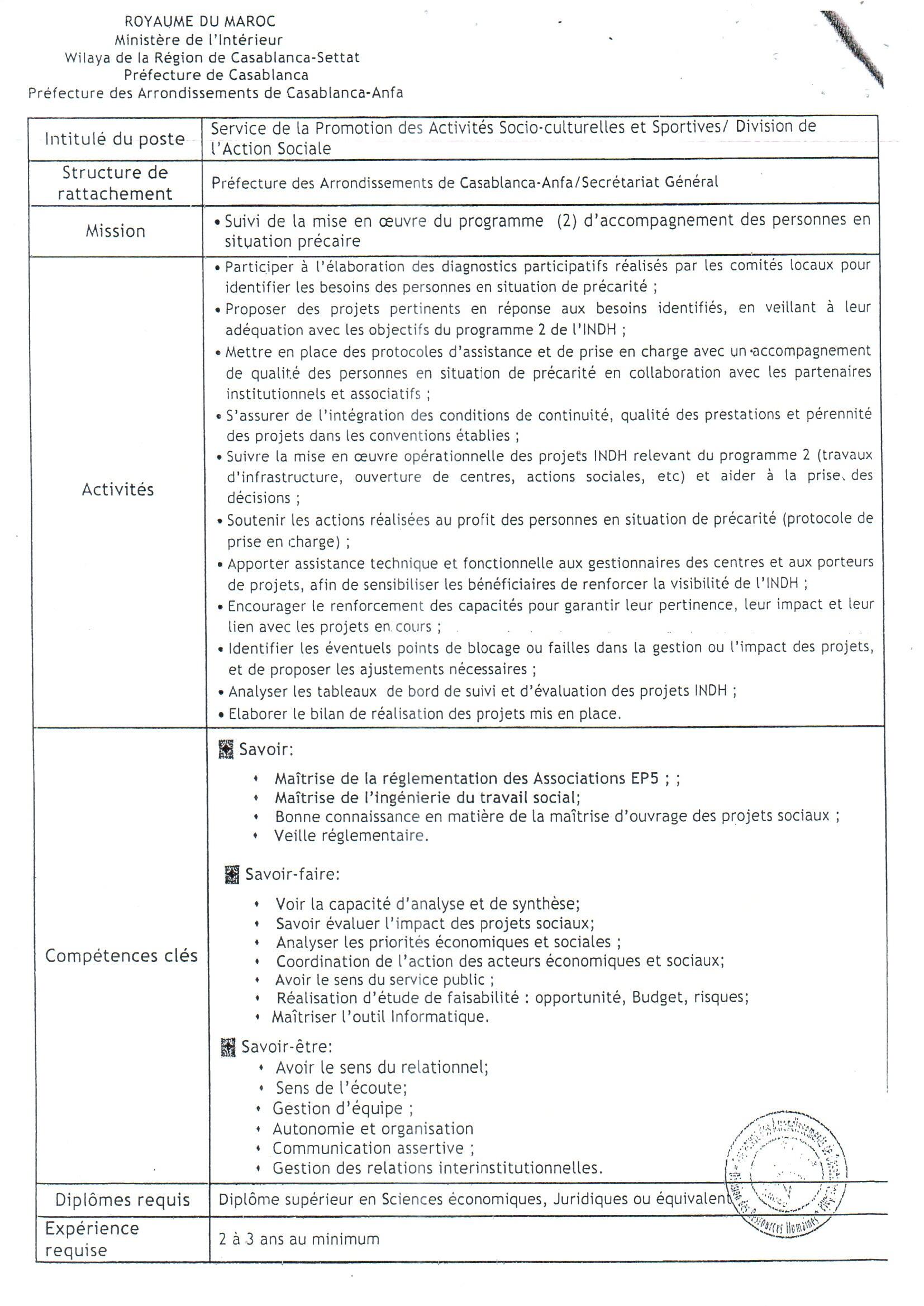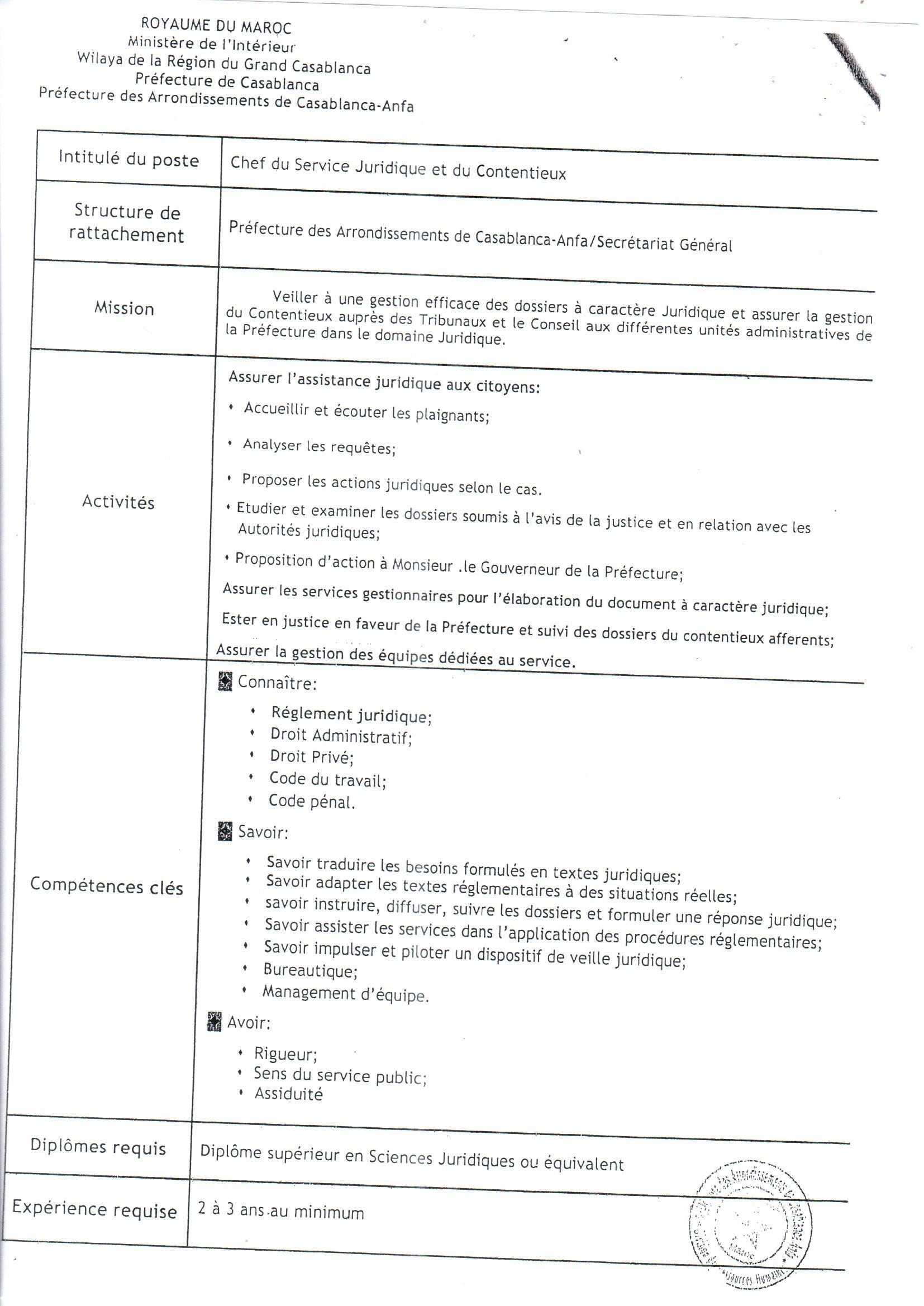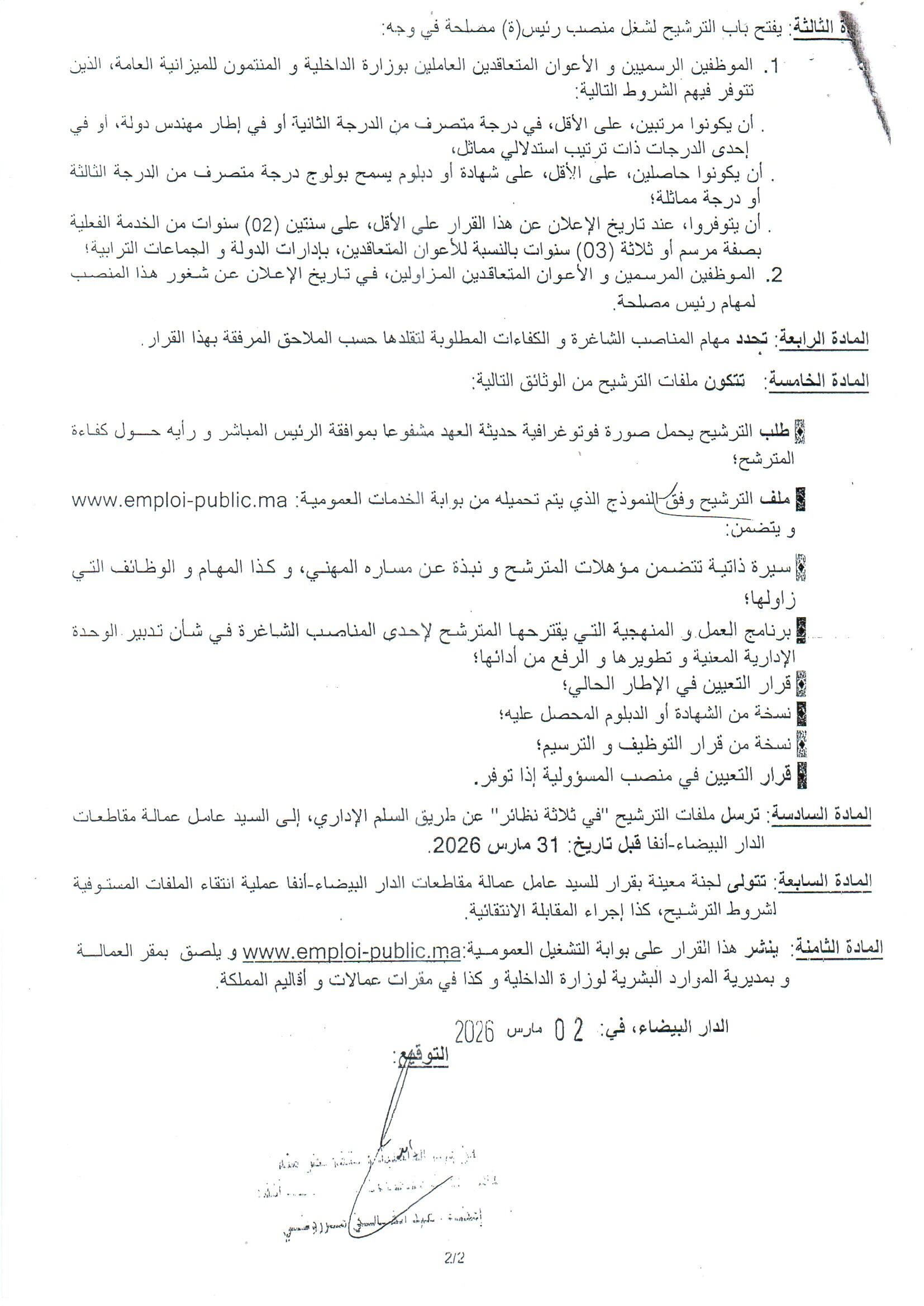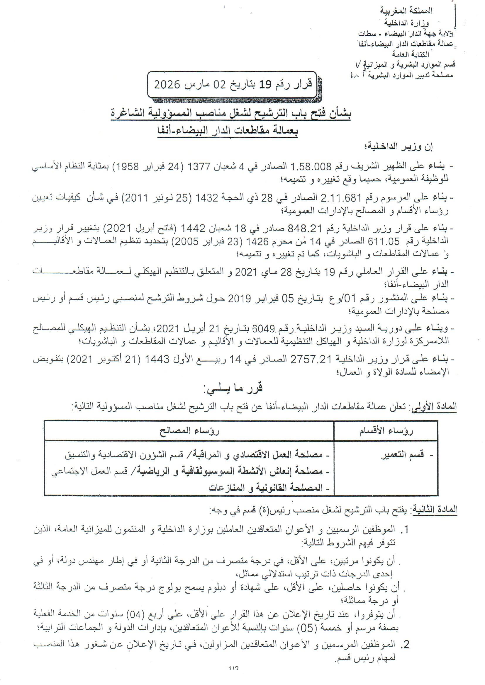 Casablanca Annonces قرار بشأن فتح باب الترشيح لشغل مناصب المسؤولية الشاغرة بعمالة مقاطعات الدار البيضاء-أنفا