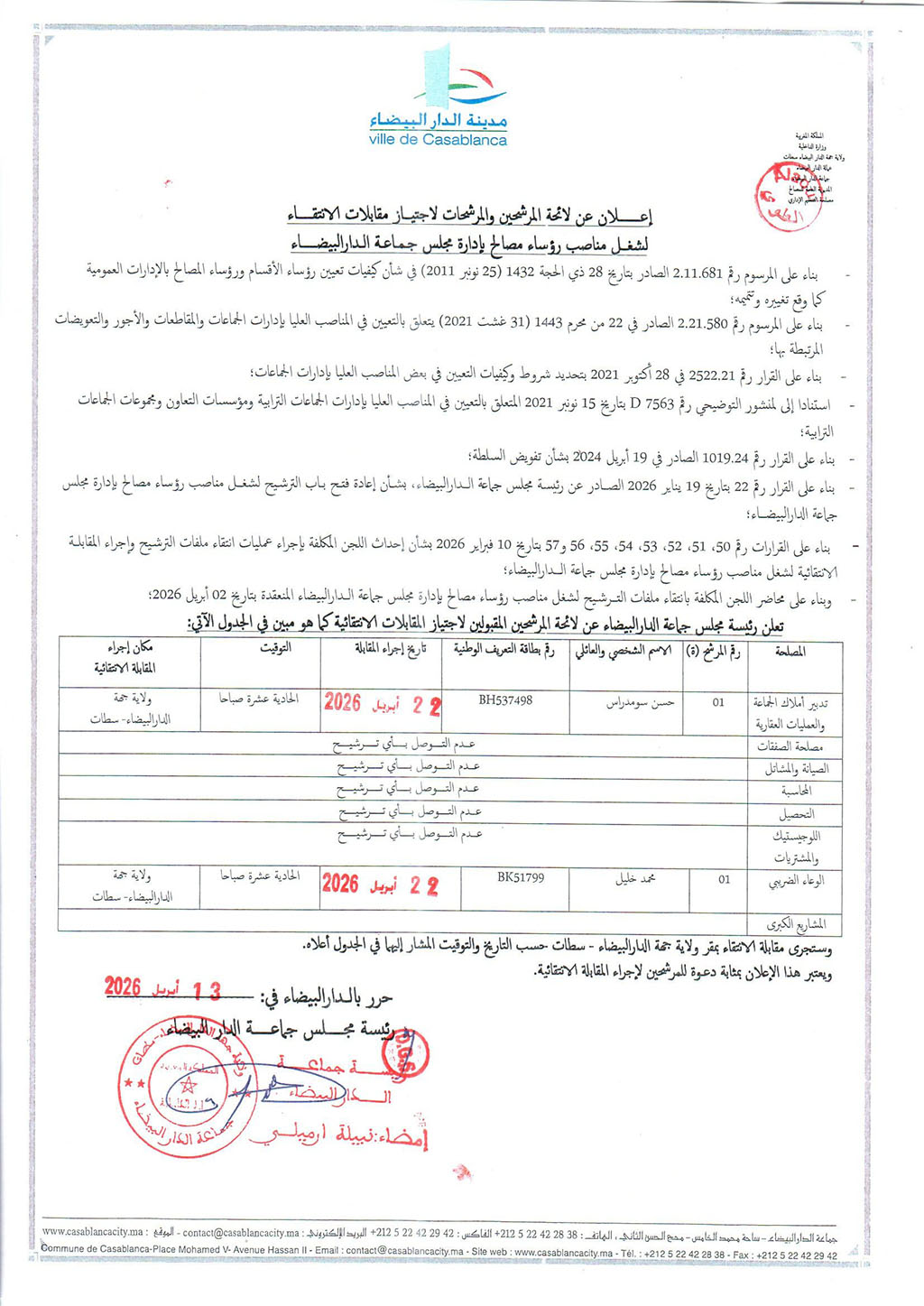 Casablanca Annonces إعلان عن لائحة المرشحين والمرشحات لاجتياز مقابلات الانتقاء لشغل مناصب رؤساء مصالح بإدارة مجلس جماعة الدار البيضاء