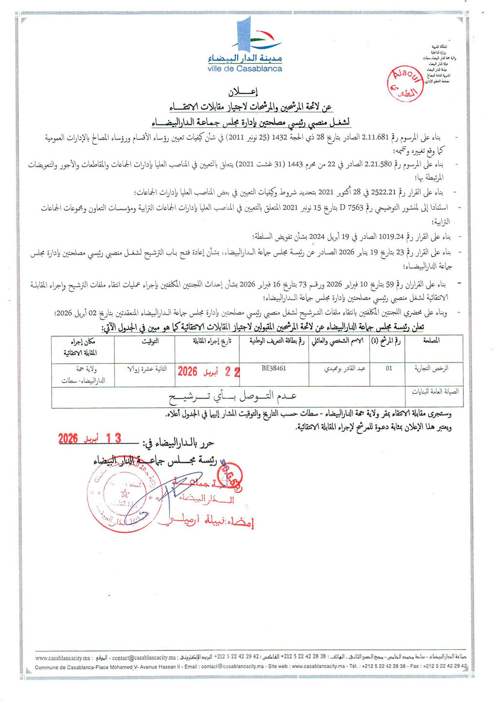 Casablanca Annonces إعلان عن لائحة المرشحين والمرشحات لاجتياز مقابلات الانتقاء لشغل منصبي رئيسي مصلحتين بإدارة مجلس جماعة الدار البيضاء