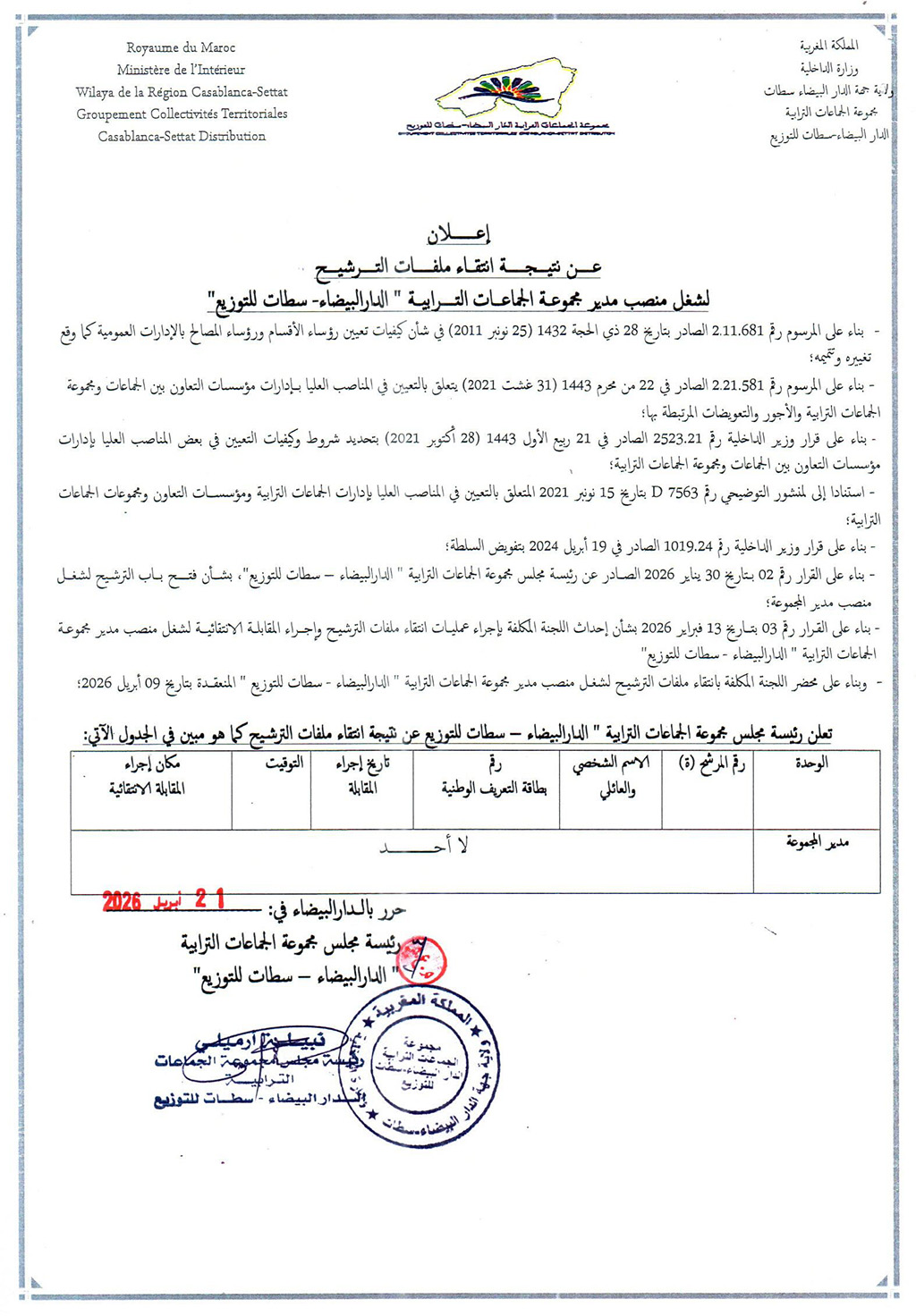 إعلان عن نتيجة انتقاء ملفات الترشيح لشغل منصب مدير مجموعة الجماعات الترابية "الدار البيضاء-سطات للتوزيع"