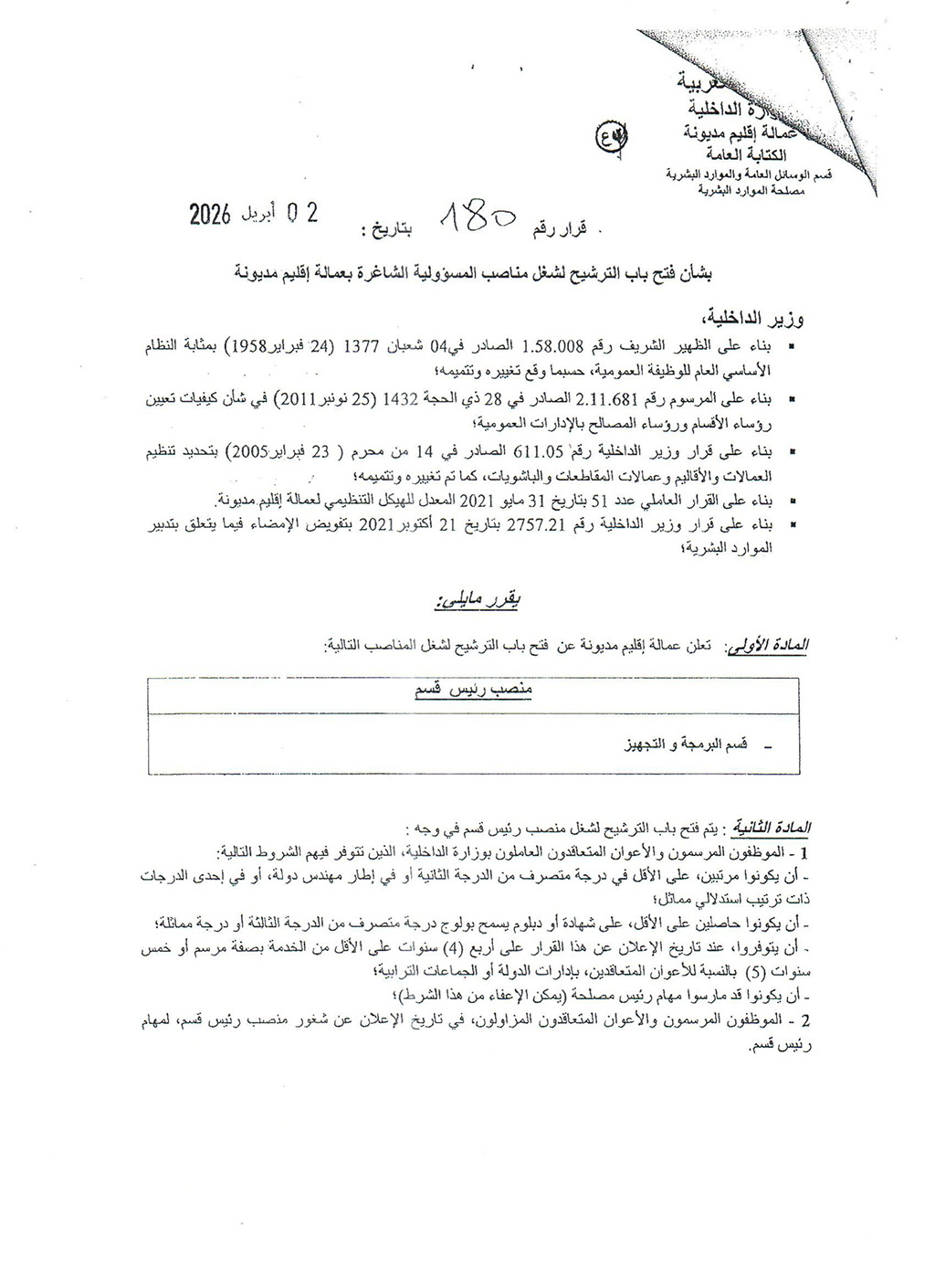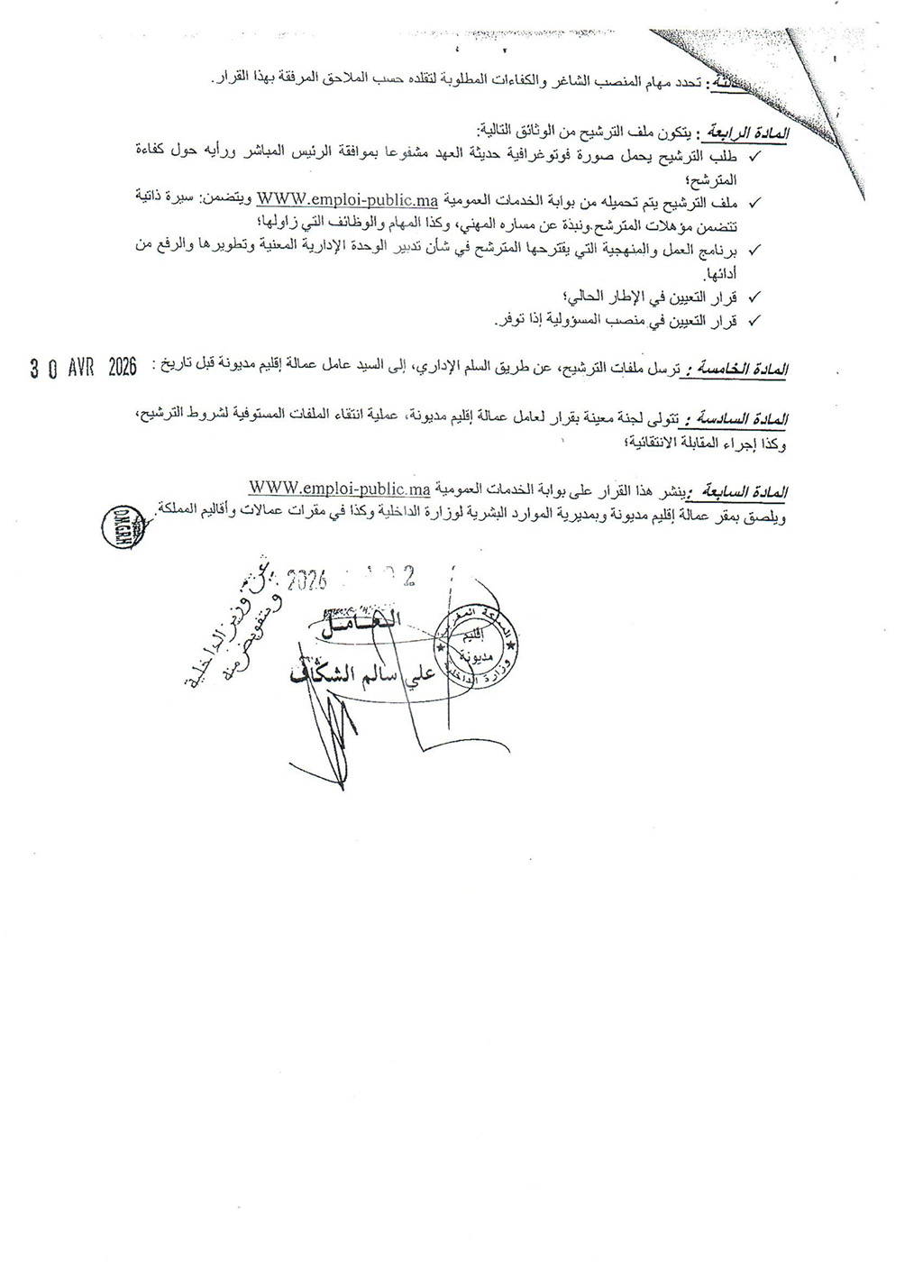 Casablanca Annonces قرار بشأن فتح باب الترشيح لشغل مناصب المسؤولية الشاغرة بعمالة إقليم مديونة